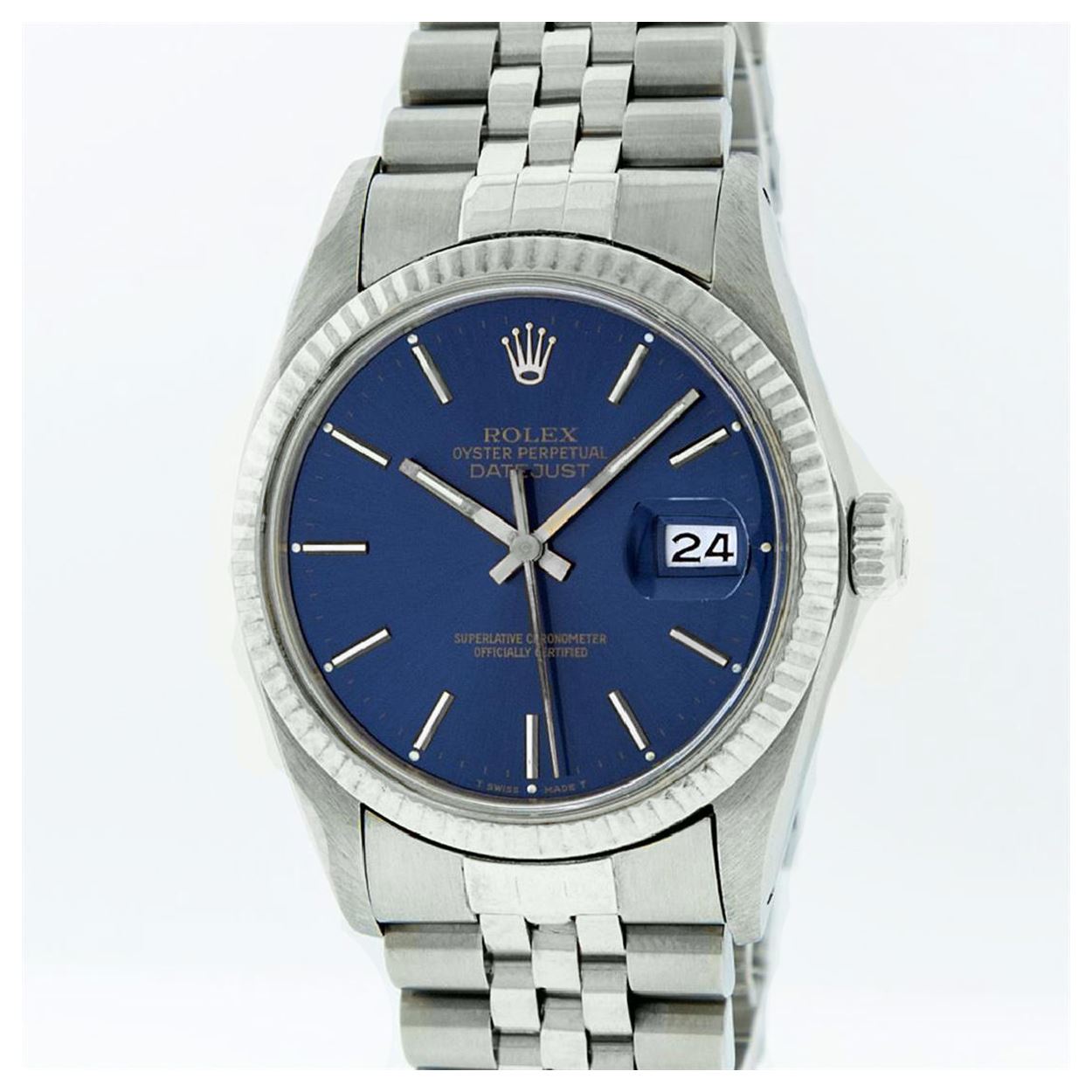 WATCH DETAILS: ITEM: WatchBRAND: RolexTYPE: Stainless SteelFEATURE: QuickSetMODEL: DateJustMADE: Swiss MadeGENDER: Men'sCONDITION: Pre-OwnedFUNCTION: DateDIAL COLOR: Royal BlueHOUR MARKERS: Index BarBEZEL TYPE: Fluted BezelBEZEL STONE: No StoneBEZEL MATERIAL: 18K GoldBRACELET TYPE: Jubilee BRACELET MATERIAL: Stainless SteelCLASP TYPE: Folding ClaspCLASP MATERIAL: Stainless SteelCASE STONE: CASE SIZE: 36mmCRYSTAL: Acrylic MOVEMENT: Automatic (Self Winding)CALIBER: 3035CROWN TYPE: Screw Down CrownWATER RESISTANCE: Waterproof to 10 ATM/100 meters/330 feetMODEL #: 16014SKU #: AMSJQP32We Buy/Sell/Trade Valuable watches, Please call us
