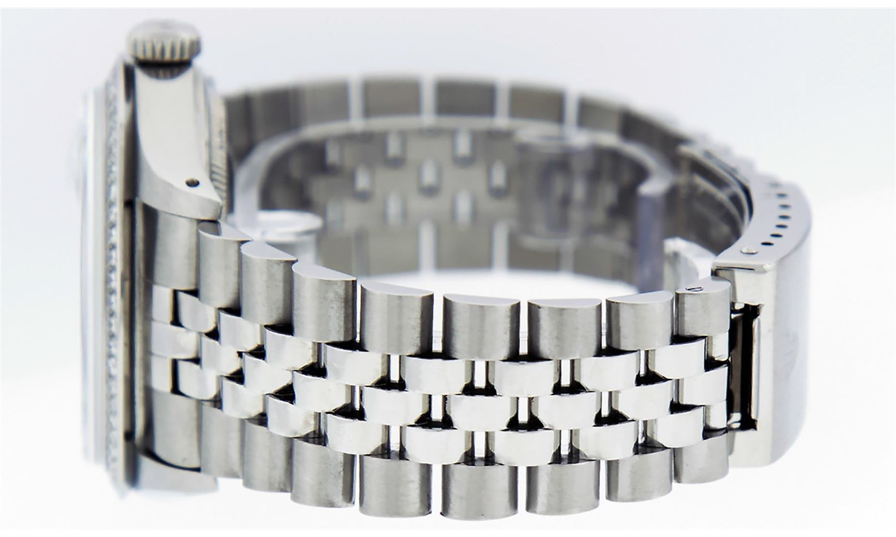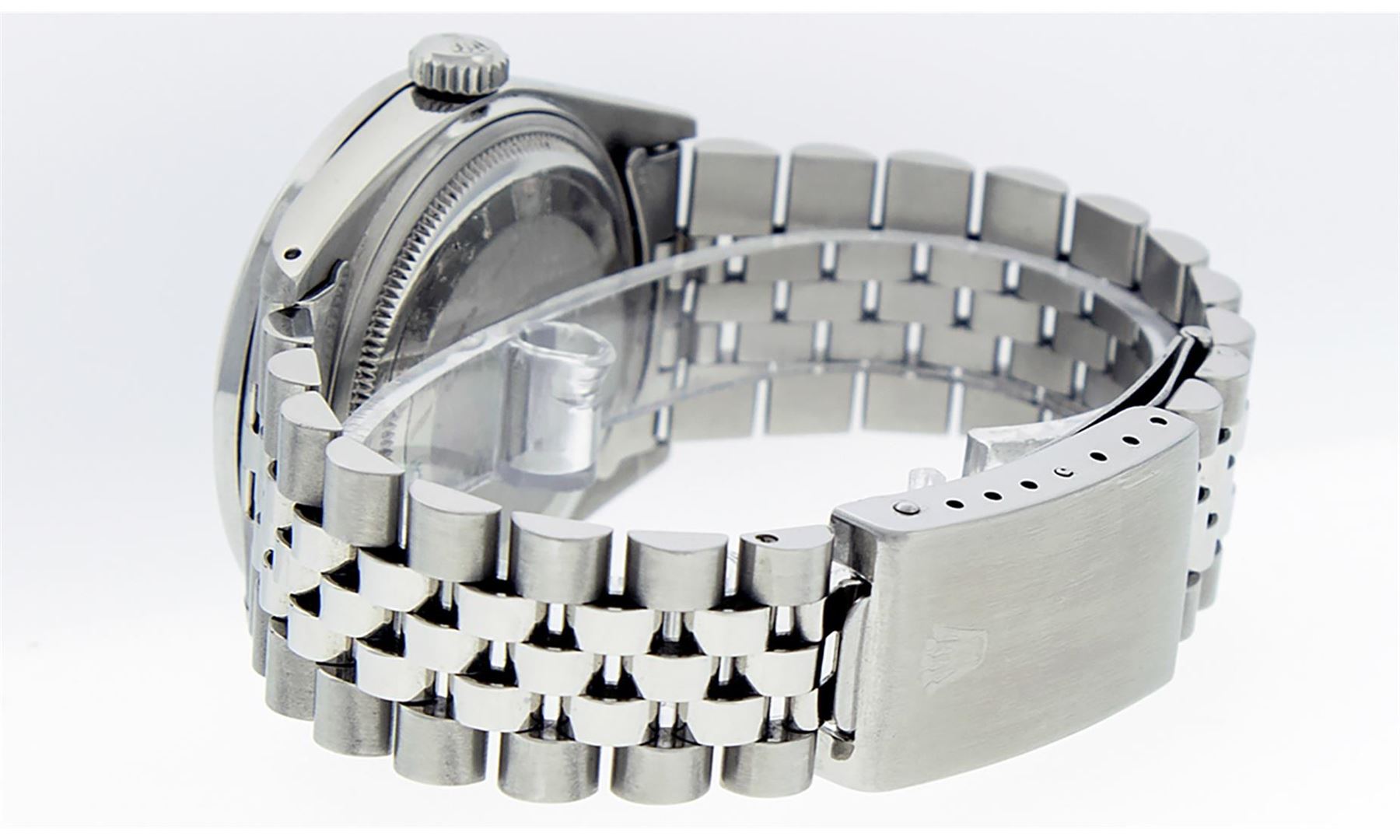 One Men's Rolex Stainless Steel Datejust Polished Bright with Satin Finish, This Watch Has Been Serviced & Electronically Tested, Stainless Steel Case: 36mm, Stainless Steel Crown, Custom Bezel: New Stainless Steel Beadset Diamond Bezel, Diamond Count: 54 Diamonds In Bezel, Total Weight 1.00 Carat, Clarity: SI-VS, Color: G to H. Custom Crystal: New Synthetic Sapphire Cyclops Lens. Custom Hands: New Luminescent Hands. Movement: Automatic Winding Movement Caliber 3035. Custom Dial: Red String Diamond Dial, Diamond Count: 58 Diamonds In Dial, Color: G to H, Clarity: VS2-SI1. Date Window: 3 O'clock Position Date Display, Quickset, Model: Datejust. Condition: G-6 Extra Fine. Bracelet: Stainless Steel Jubilee Band. Bright Polish & Satin Finish. 7.0 Inch Length, Adjustable. Standard Clasp, With Rolex Logo. This Watch Has Been Serviced Time Tested And Is In Excellent Condition It Is Free Of All Scratches And Dents.