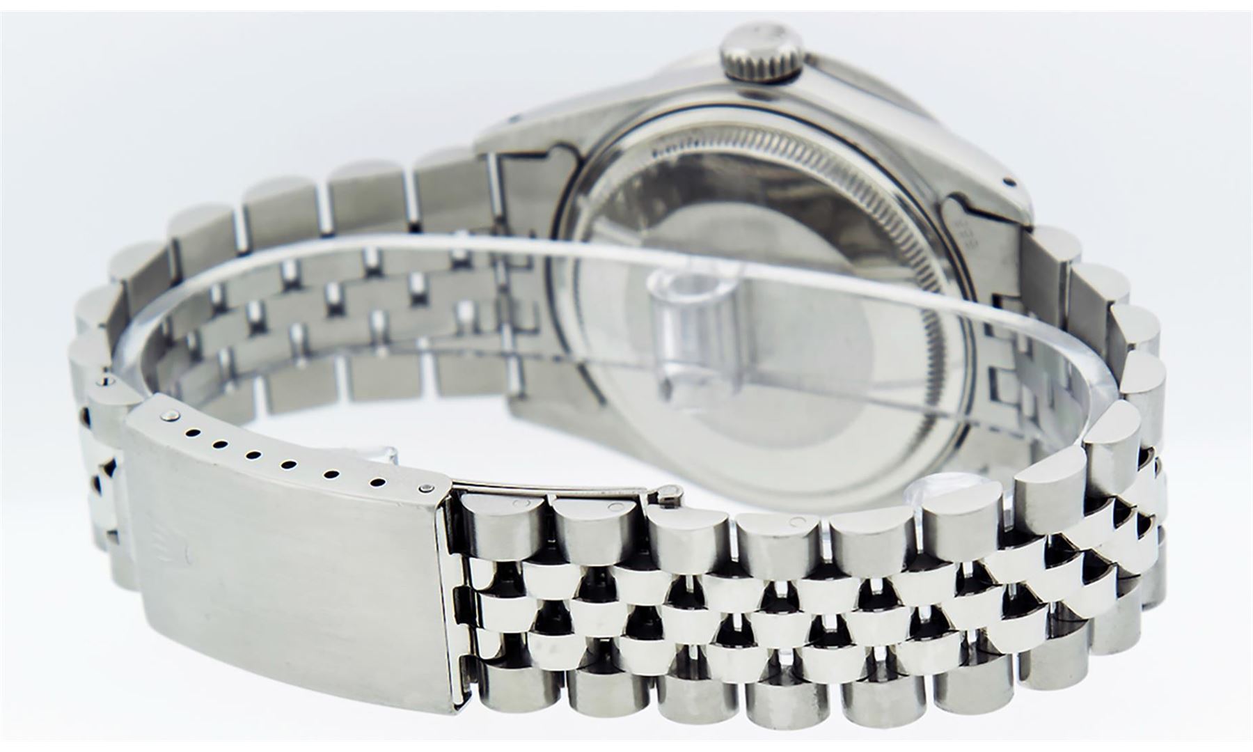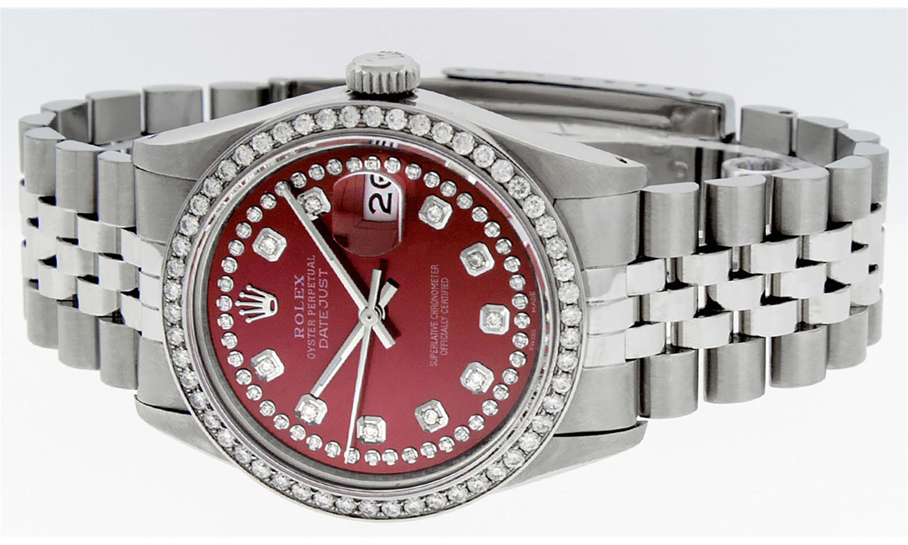 One Men's Rolex Stainless Steel Datejust Polished Bright with Satin Finish, This Watch Has Been Serviced & Electronically Tested, Stainless Steel Case: 36mm, Stainless Steel Crown, Custom Bezel: New Stainless Steel Beadset Diamond Bezel, Diamond Count: 54 Diamonds In Bezel, Total Weight 1.00 Carat, Clarity: SI-VS, Color: G to H. Custom Crystal: New Synthetic Sapphire Cyclops Lens. Custom Hands: New Luminescent Hands. Movement: Automatic Winding Movement Caliber 3035. Custom Dial: Red String Diamond Dial, Diamond Count: 58 Diamonds In Dial, Color: G to H, Clarity: VS2-SI1. Date Window: 3 O'clock Position Date Display, Quickset, Model: Datejust. Condition: G-6 Extra Fine. Bracelet: Stainless Steel Jubilee Band. Bright Polish & Satin Finish. 7.0 Inch Length, Adjustable. Standard Clasp, With Rolex Logo. This Watch Has Been Serviced Time Tested And Is In Excellent Condition It Is Free Of All Scratches And Dents.