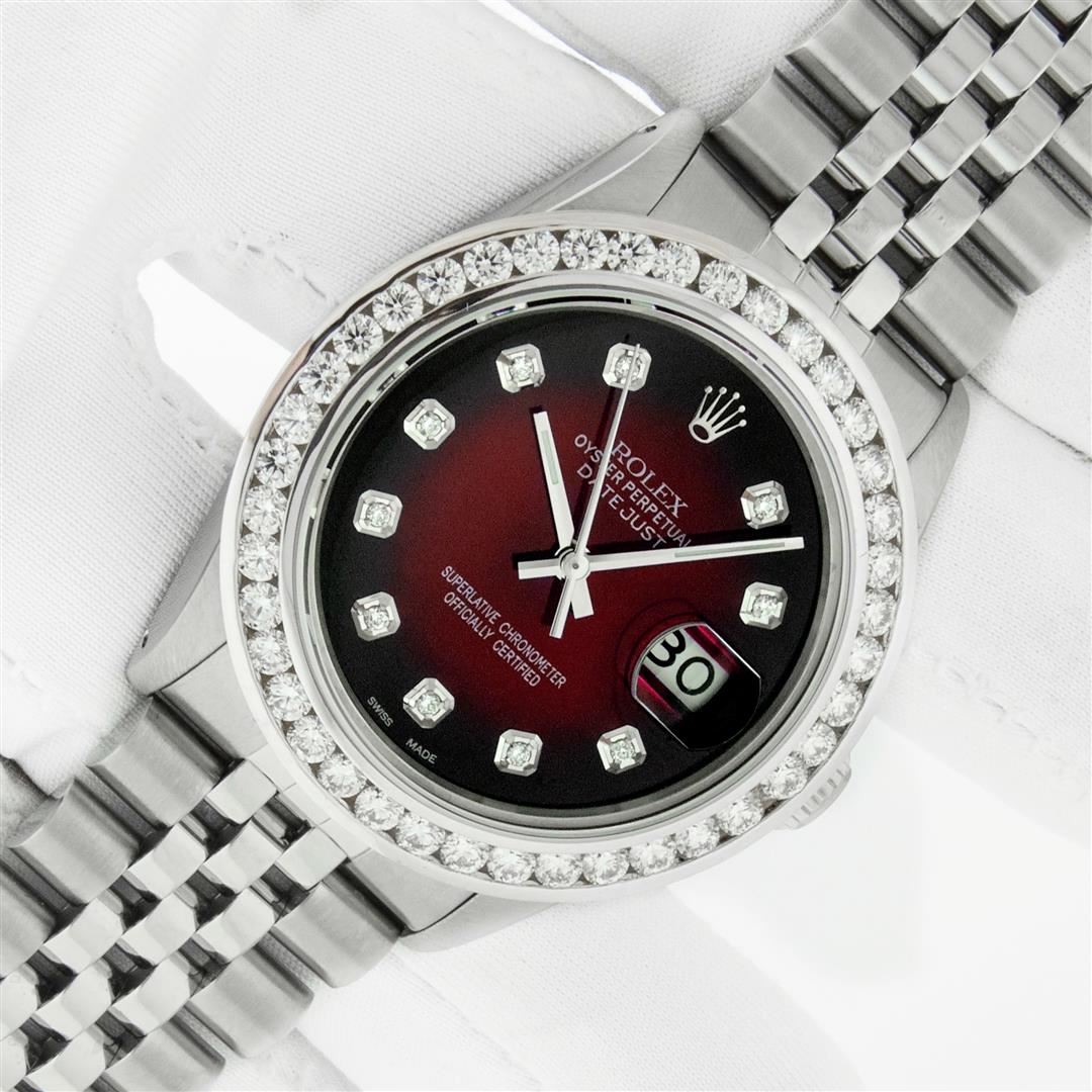 One Mens Stainless Steel Rolex Datejust Polished Bright with Satin Finish, Fully Serviced & Electronically Tested, Stainless Steel Case: 36mm, Rolex Stainless Steel Crown, Custom Bezel: New 18K White Gold 3.00 Ctw Diamond Bezel, Diamond Count: 40 Diamonds, Total Weight 3.0 Carat, Clarity: SI-VS, Color: G to H. Custom Crystal: New Sapphire With Magnified Date Window. Custom Hands: New Luminescent Hands. Rolex Movement: Automatic Winding Movement. Custom Dial: Refinished To Red Vignette With Added Diamond Hour Markers, 10 Diamonds in Dial, G To H In Color, Clarity: SI-VS. Date Window: 3 O'Clock Position Date Display, Quickset, Model: Datejust 36mm, Condition: G-6 Extra Fine. Rolex Bracelet: Rolex Stainless Steel Jubilee Band. Bright Polish & Satin Finish. 7.0 Inch Length, Adjustable. Standard Clasp, With Rolex Logo. This Pre Owned Watch Has Been Serviced And Polished It Is Free Of All Scratches And Dents. This Watch Comes With A Rolex Box.
