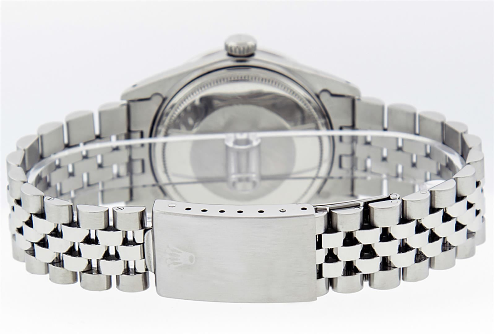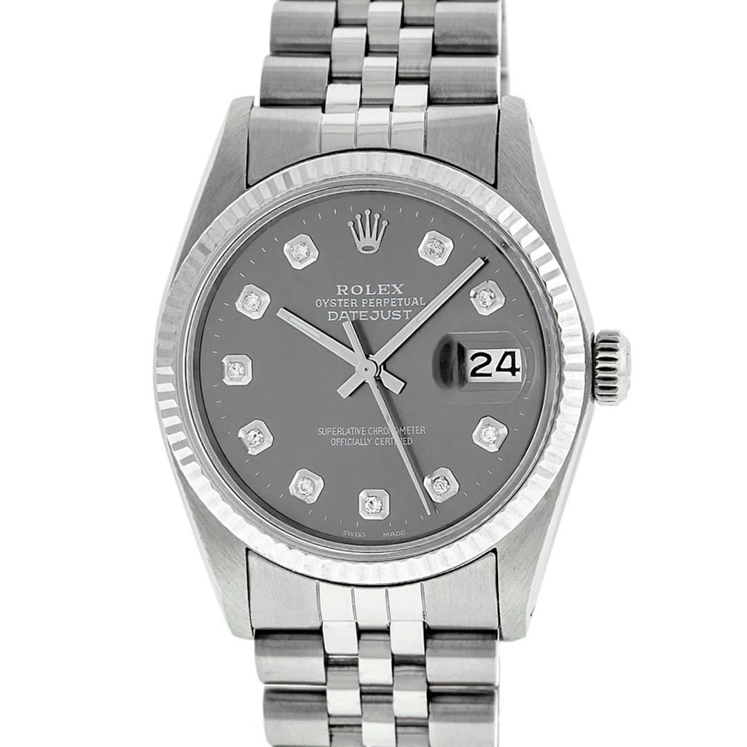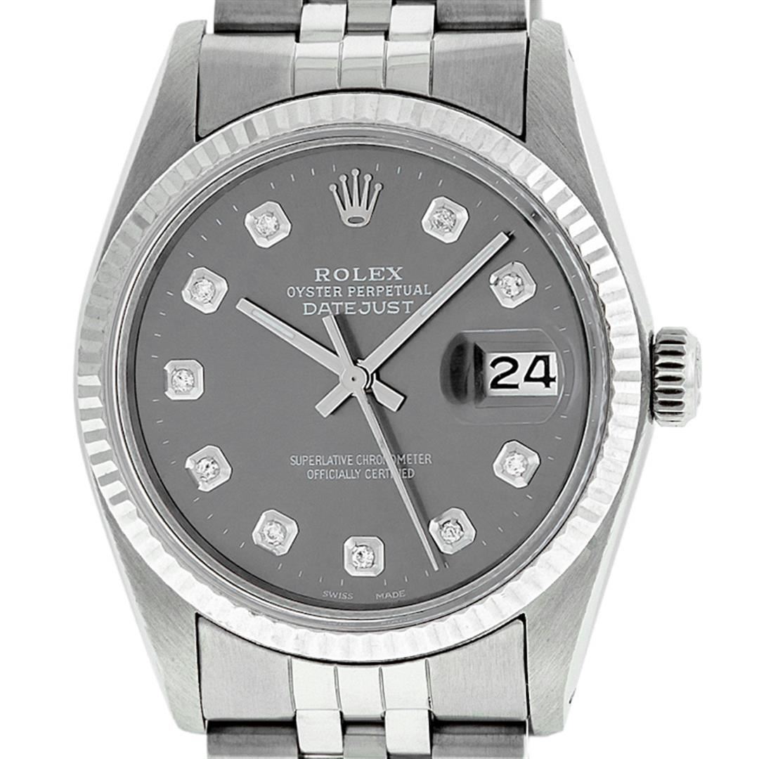 One Men's Stainless Steel Rolex Datejust Polished Bright with Satin Finish, Serviced & Electronically Tested, Stainless Steel Case: 36mm, Stainless Steel Crown, Bezel: 14K White Gold Fluted Bezel. Custom Crystal: New Acrylic Cyclops Lens. Custom Hands: New Luminescent Hands. Movement: Automatic Winding Movement Caliber 3035. Custom Dial: Slate Grey Diamond Dial With Dash Tracks, Diamond Count: 10 Diamonds in Dial, G To H In Color, SI-VS Clarity. Date Window: 3 O'clock Position Date Display, Quickset, Model: Datejust, Condition: G-6 Extra Fine. Bracelet: Stainless Steel Jubilee. Bright Polish & Satin Finish. 7.0 Inch Length, Adjustable. Standard Clasp, With Rolex Logo. Watch Has Been Serviced And Polished It Is Free Of All Scratches And Dents.
