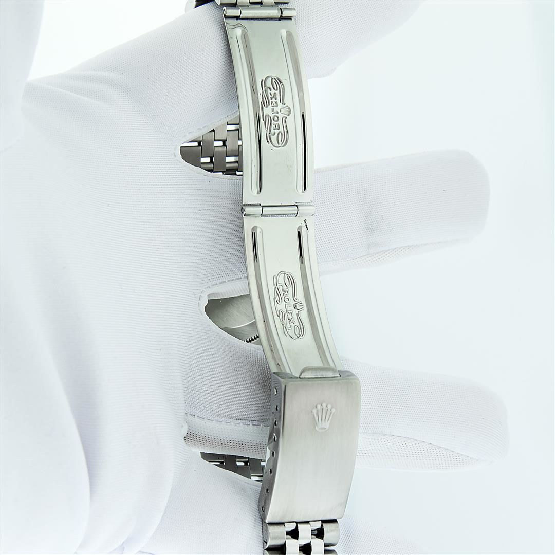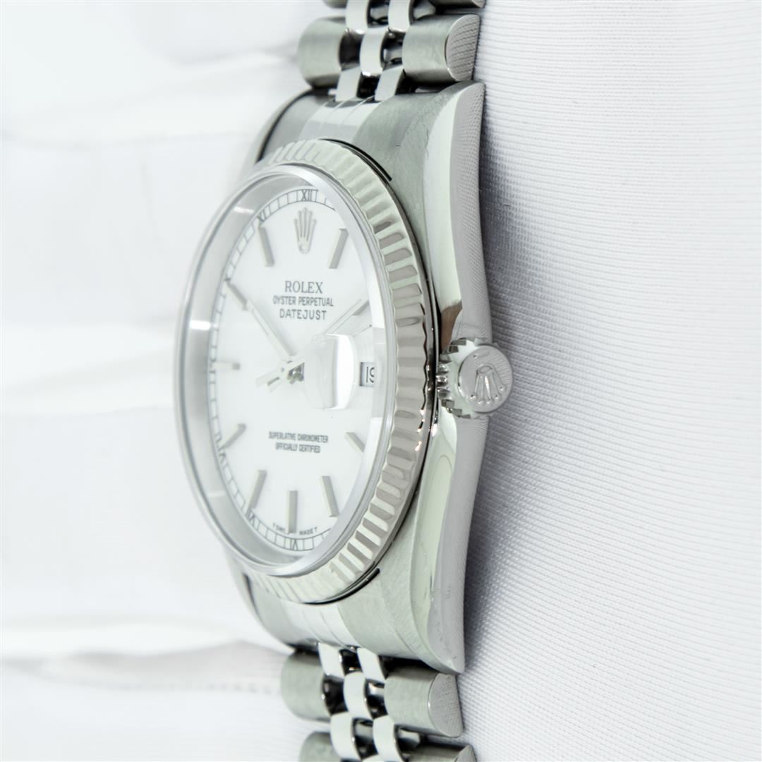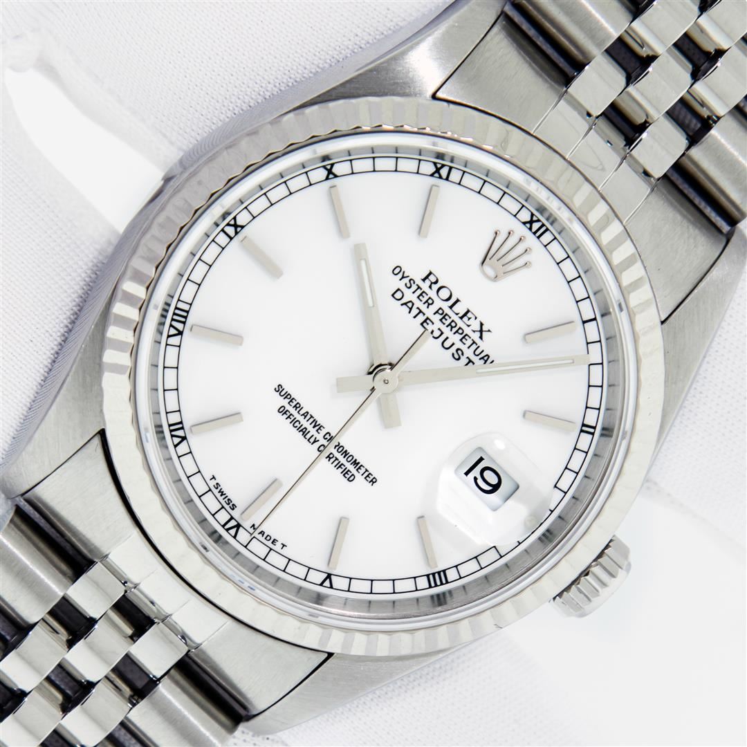 One Men's Pre Owned Rolex Stainless Steel Datejust Polished Bright with Satin Finish, Serviced & Electronically Tested, Rolex Stainless Steel Case: 36mm, Rolex Stainless Steel Crown, Rolex Bezel: 18K White Gold Fluted Bezel. Custom Crystal: New Sapphire With Magnified Date Window. Rolex Movement: Automatic Winding Movement Caliber 3135. Rolex Dial: White Index With Roman Square Track. Hands: White Lumi Hands. Date Window: 3 O'clock Position Date Display, Quickset, Model: Quickset Datejust. Condition: G-6 Extra Fine. Rolex Bracelet: Stainless Steel Jubilee Band. Bright Polish & Satin Finish. 7.0 Inch Length, Adjustable. Standard Clasp, With Rolex Logo. This Pre Owned Watch Has Been Serviced Time Tested And Is In Excellent Condition It Is Free Of All Scratches And Dents.