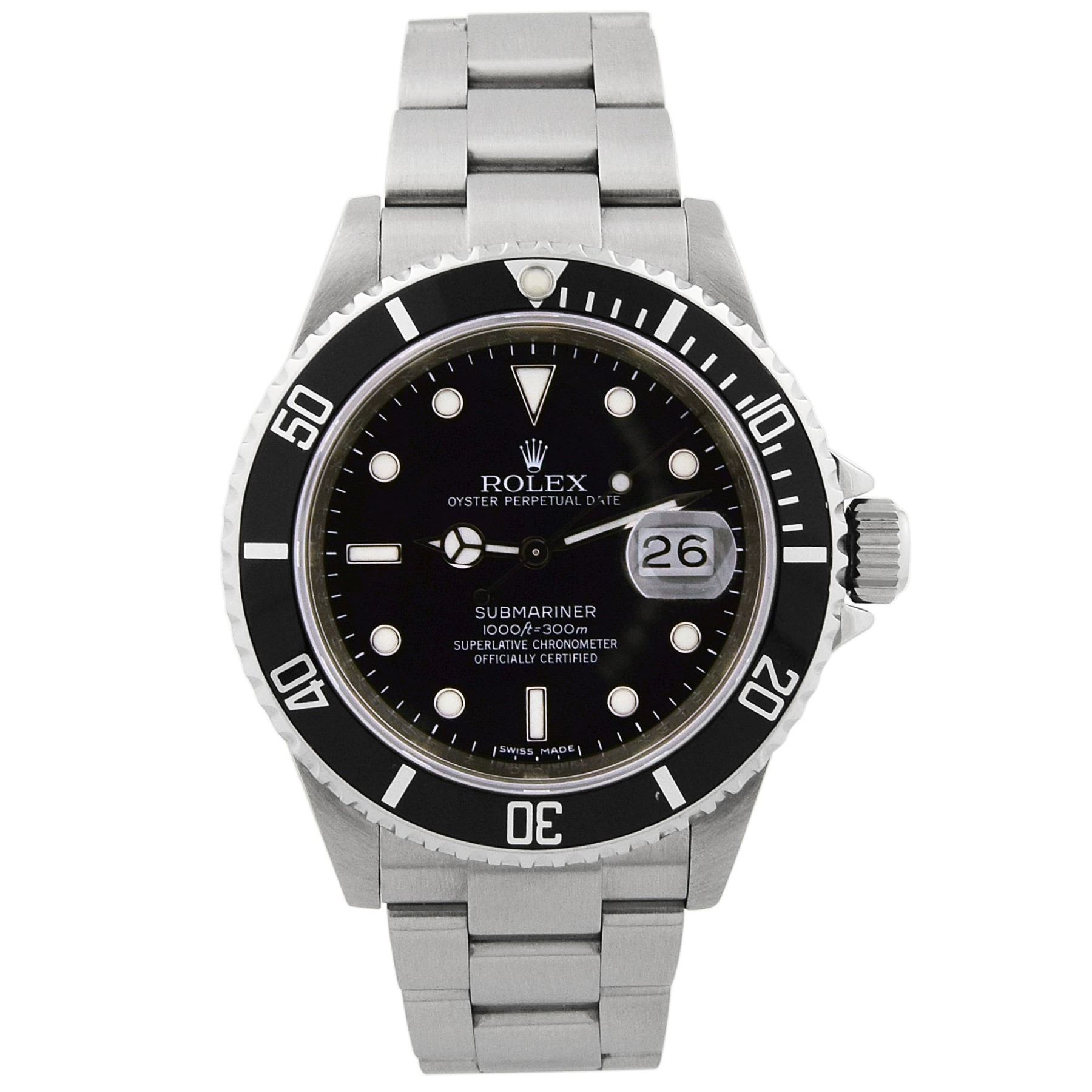 Model: Submariner Date. Reference #: 16610. Case: Stainless Steel. Case Size: 40mm. Bracelet: Oyster Bracelet. Dial: Black Dial w/ Dot Hour Markers. Lume: Luminous Hands & Hour Markers. Bezel: Unidirectional Rotatable 60-Minute Black Aluminum Bezel. Date Window: 3 O'clock Position w/ Cyclops Lens. Movement: Automatic Winding Movement; Rolex Calibre 3135. Power Reserve: 48 Hours. Water Resistant: Yes 300 Meters/1000 Feet. Crystal: Scratch-Resistant Sapphire Crystal. Condition: Pre-Owned; Great Condition. Rolex Box Included. Circa: 2003 (F Serial). All Pre-Owned watches are guaranteed to be 100% genuine. Your watch will come with a 2-year limited warranty, original box, and appraisal.