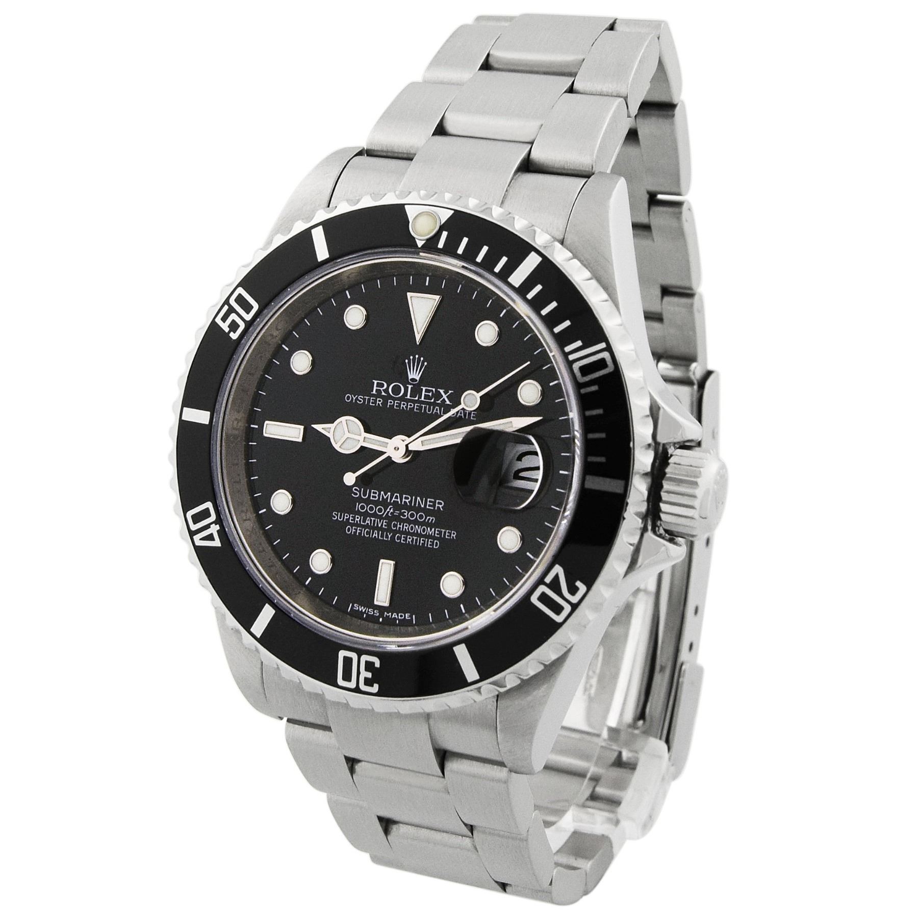 Model: Submariner Date. Reference #: 16610. Case: Stainless Steel. Case Size: 40mm. Bracelet: Oyster Bracelet. Dial: Black Dial w/ Dot Hour Markers. Lume: Luminous Hands & Hour Markers. Bezel: Unidirectional Rotatable 60-Minute Black Aluminum Bezel. Date Window: 3 O'clock Position w/ Cyclops Lens. Movement: Automatic Winding Movement; Rolex Calibre 3135. Power Reserve: 48 Hours. Water Resistant: Yes 300 Meters/1000 Feet. Crystal: Scratch-Resistant Sapphire Crystal. Condition: Pre-Owned; Great Condition. Rolex Box Included. Circa: 2003 (F Serial). All Pre-Owned watches are guaranteed to be 100% genuine. Your watch will come with a 2-year limited warranty, original box, and appraisal.
