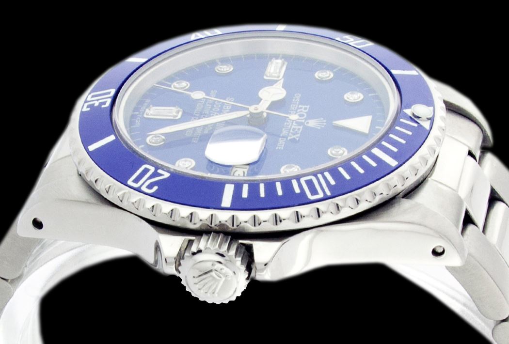 WATCH DETAILS: ITEM: WatchBRAND: RolexTYPE: SubmarinerFEATURE: QuickSetMODEL: DateJustMADE: Swiss MadeGENDER: Men'sCONDITION: Pre-OwnedFUNCTION: DateDIAL COLOR: BlueHOUR MARKERS: 8 + 2 , 8 Round and 2 Baguette Custom Made DiamondBEZEL TYPE: Rotatable with Blue Insert BezelBEZEL STONE: No StoneBEZEL MATERIAL: Stainless SteelBRACELET TYPE: OysterBRACELET MATERIAL: Stainless SteelCLASP TYPE: Folding ClaspCLASP MATERIAL: Stainless SteelCASE STONE: CASE SIZE: 40mmCRYSTAL: Scratch Resistance Sapphire CrystalMOVEMENT: Automatic (Self Winding)CALIBER: 3035CROWN TYPE: Screw Down CrownWATER RESISTANCE: Waterproof to 10 ATM/100 meters/330 feetMODEL #: 16610SKU #: AMMOQS91We Buy/Sell/Trade Valuable watches, Please call us