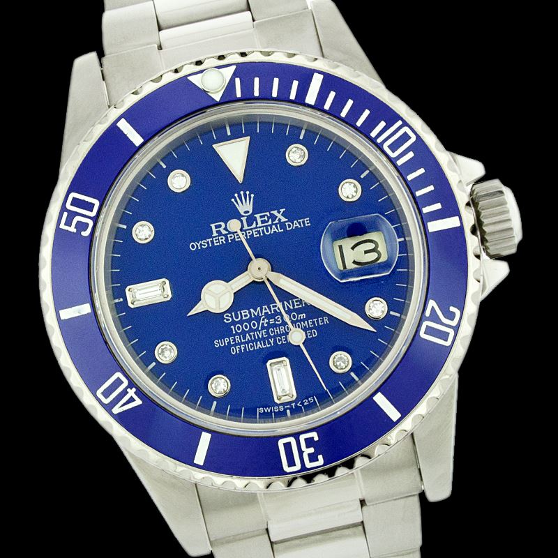 WATCH DETAILS: ITEM: WatchBRAND: RolexTYPE: SubmarinerFEATURE: QuickSetMODEL: DateJustMADE: Swiss MadeGENDER: Men'sCONDITION: Pre-OwnedFUNCTION: DateDIAL COLOR: BlueHOUR MARKERS: 8 + 2 , 8 Round and 2 Baguette Custom Made DiamondBEZEL TYPE: Rotatable with Blue Insert BezelBEZEL STONE: No StoneBEZEL MATERIAL: Stainless SteelBRACELET TYPE: OysterBRACELET MATERIAL: Stainless SteelCLASP TYPE: Folding ClaspCLASP MATERIAL: Stainless SteelCASE STONE: CASE SIZE: 40mmCRYSTAL: Scratch Resistance Sapphire CrystalMOVEMENT: Automatic (Self Winding)CALIBER: 3035CROWN TYPE: Screw Down CrownWATER RESISTANCE: Waterproof to 10 ATM/100 meters/330 feetMODEL #: 16610SKU #: AMMOQS91We Buy/Sell/Trade Valuable watches, Please call us