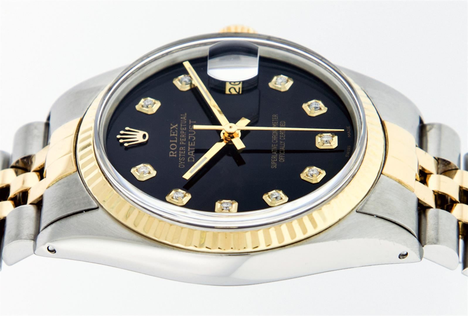 One Men's 14K Yellow Gold Two Tone Rolex Datejust Polished, Serviced & Electronically Tested, 14K Yellow Gold & Stainless Steel Case: 36mm, 14K Yellow Gold Crown, Bezel: 14K Yellow Gold Fluted Bezel. Custom Crystal: New Acrylic Cyclops Lens. Custom Hands: New Luminescent Hands. Movement: Automatic Winding Movement Caliber 3035. Custom Dial: Black Diamond Dial, Diamond Count: 10 Diamonds In Dial, Color: G to H, Clarity: SI-VS. Date Window: 3 O'Clock Position Date Display, Quickset, Model: 16013 Condition: G-6 Extra Fine. Bracelet: Two Tone 14K Yellow Gold & Stainless Steel Jubilee. Bright Polish. 7.0 Inch Length, Adjustable. Standard Clasp, With Rolex Logo. This Watch Has Been Serviced Time Tested And Is In Excellent Condition It Is Free Of All Scratches And Dents.