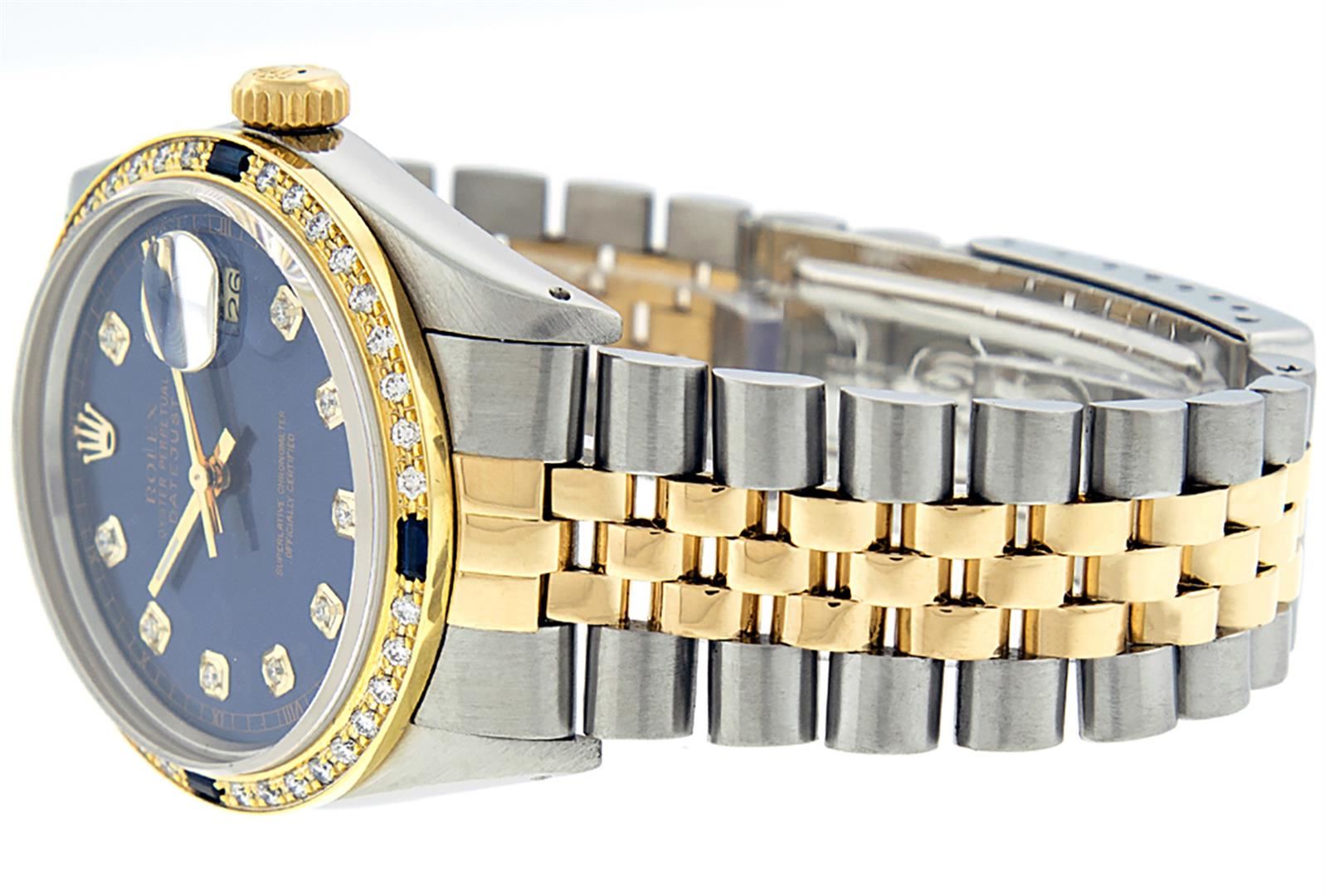 One Men's 14K Yellow Gold Two Tone Rolex Datejust Polished, Serviced & Electronically Tested, 14K Yellow Gold & Stainless Steel Case: 36mm, 14K Yellow Gold Crown, Custom Bezel: New 18K Yellow Gold Sapphire Beadset Diamond Bezel, Diamond Count: 36 Diamonds + 4 Sapphires, Total Weight 1.00 Carat, Clarity: SI-VS, Color: G to H. Custom Crystal: New Synthetic Sapphire Cyclops Lens. Custom Hands: New Luminescent Hands. Movement: Automatic Winding Movement Caliber 3035. Custom Dial: Blue With Diamond Hour Markers. Diamond Count: 10 Diamonds, Clarity: SI-VS, Color: Color G to H Date Window: 3 O'clock Position Date Display, Quickset, Model: 16013 Condition: G-6 Extra Fine. Bracelet: Two Tone 14K Yellow Gold & Stainless Steel Jubilee. Bright Polish. 7.0 Inch Length, Adjustable. Standard Clasp, With Rolex Logo. This Watch Has Been Serviced Time Tested And Is In Excellent Condition It Is Free Of All Scratches And Dents.