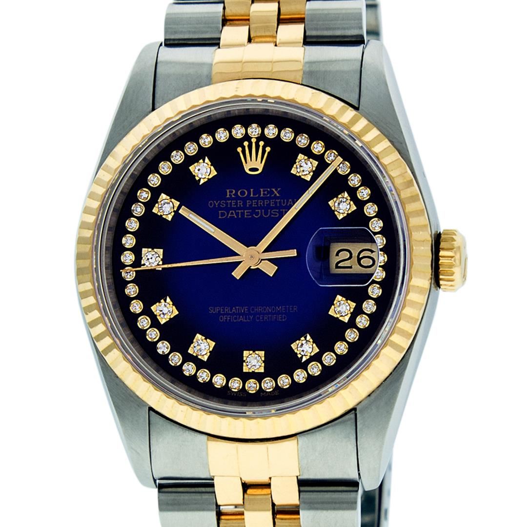 One Men's 14K Yellow Gold Two Tone Rolex Datejust Polished, Serviced & Electronically Tested, 14K Yellow Gold & Stainless Steel Case: 36mm, 14K Yellow Gold Crown, Bezel: 14K Yellow Gold Fluted Bezel. Custom Crystal: New Acrylic Cyclops Lens. Custom Hands: New Luminescent Hands. Movement: Automatic Winding Movement Caliber 3035. Custom Dial: Blue Vignette String Dial Set With VS Diamond Hour Markers, Diamond Count: 58 Diamonds in Dial, G To H In Color, SI-VS Clarity. Date Window: 3 O'clock Position Date Display, Quickset, Model: 16013 Datejust, Condition: G-6 Extra Fine. Bracelet: Two Tone 14K Yellow Gold & Stainless Steel Jubilee. Bright Polish. 7.0 Inch Length, Adjustable. Standard Clasp, With Rolex Logo. This Watch Has Been Serviced And Polished It Is Free Of All Scratches And Dents.