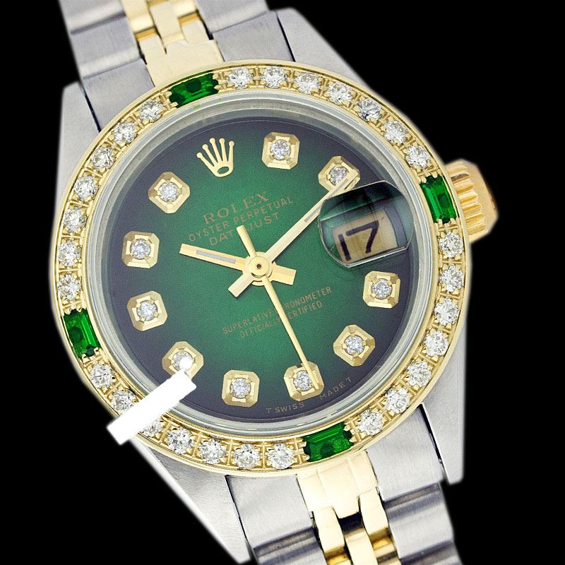 WATCH DETAILS: ITEM: WatchBRAND: RolexTYPE: Two ToneFEATURE: QuickSetMODEL: DateJustMADE: Swiss MadeGENDER: Men'sCONDITION: Pre-OwnedFUNCTION: DateDIAL COLOR: GreenHOUR MARKERS: 10 Round Custom Made DiamondBEZEL TYPE: Custom Made Diamond & Emerald BezelBEZEL STONE: Diamond 1 CTW G-VVS1 & 4 Colombian EmeraldBEZEL MATERIAL: 18K GoldBRACELET TYPE: Jubilee BRACELET MATERIAL: 14K Yellow Gold & Stainless SteelCLASP TYPE: Folding ClaspCLASP MATERIAL: Stainless SteelCASE STONE: CASE SIZE: 36mmCRYSTAL: Scratch Resistance Sapphire CrystalMOVEMENT: Automatic (Self Winding)CALIBER: 3035CROWN TYPE: Screw Down CrownWATER RESISTANCE: Waterproof to 10 ATM/100 meters/330 feetMODEL #: 16013SKU #: AMTJQS153We Buy/Sell/Trade Valuable watches, Please call us