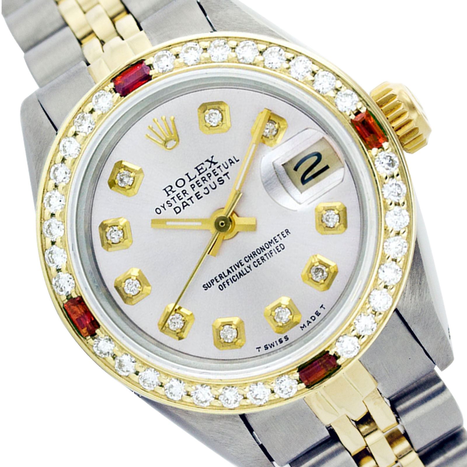 WATCH DETAILS: ITEM: WatchBRAND: RolexTYPE: Two ToneFEATURE: QuickSetMODEL: DateJustMADE: Swiss MadeGENDER: Men'sCONDITION: Pre-OwnedFUNCTION: DateDIAL COLOR: WhiteHOUR MARKERS: 10 Round Custom Made DiamondBEZEL TYPE: Custom Made Diamond & Ruby BezelBEZEL STONE: Diamond G-VVS1 & 4 Burmise RubyBEZEL MATERIAL: 18K GoldBRACELET TYPE: Jubilee BRACELET MATERIAL: 14K Yellow Gold & Stainless SteelCLASP TYPE: Folding ClaspCLASP MATERIAL: Stainless SteelCASE STONE: CASE SIZE: 36mmCRYSTAL: Scratch Resistance Sapphire CrystalMOVEMENT: Automatic (Self Winding)CALIBER: 3035CROWN TYPE: Screw Down CrownWATER RESISTANCE: Waterproof to 10 ATM/100 meters/330 feetMODEL #: 16013SKU #: AMTJQS74We Buy/Sell/Trade Valuable watches, Please call us