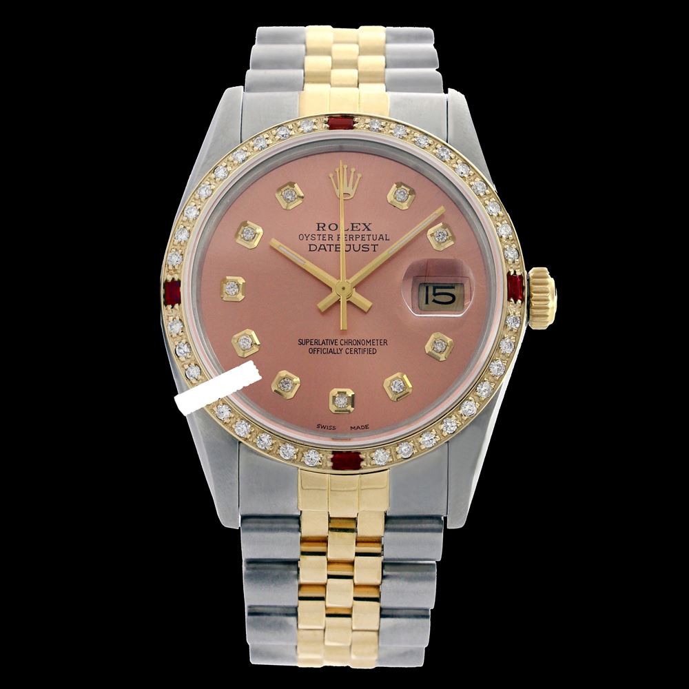 WATCH DETAILS: ITEM: WatchBRAND: RolexTYPE: Two ToneFEATURE: QuickSetMODEL: DateJustMADE: Swiss MadeGENDER: Men'sCONDITION: Pre-OwnedFUNCTION: DateDIAL COLOR: PinkHOUR MARKERS: 10 Round Custom Made DiamondBEZEL TYPE: Custom Made Diamond & Ruby BezelBEZEL STONE: Diamond G-VVS1 & 4 Burmise RubyBEZEL MATERIAL: 18K GoldBRACELET TYPE: Jubilee BRACELET MATERIAL: 14K Yellow Gold & Stainless SteelCLASP TYPE: Folding ClaspCLASP MATERIAL: Stainless SteelCASE STONE: CASE SIZE: 36mmCRYSTAL: Scratch Resistance Sapphire CrystalMOVEMENT: Automatic (Self Winding)CALIBER: 3035CROWN TYPE: Screw Down CrownWATER RESISTANCE: Waterproof to 10 ATM/100 meters/330 feetMODEL #: 16013SKU #: AMTJQS10We Buy/Sell/Trade Valuable watches, Please call us