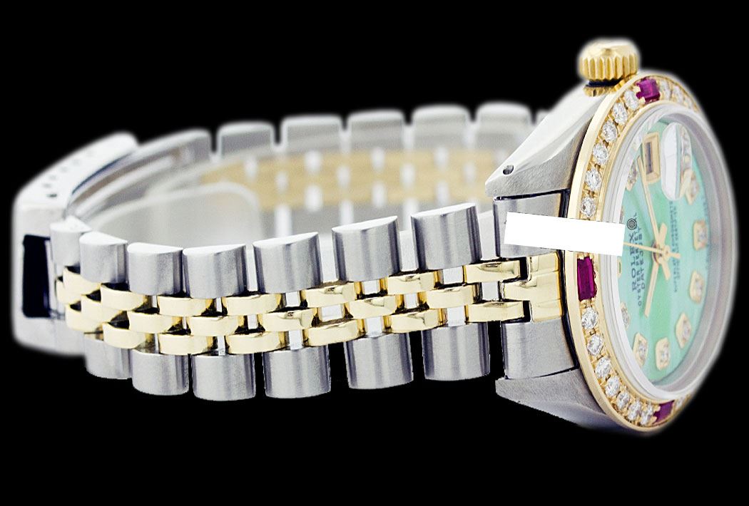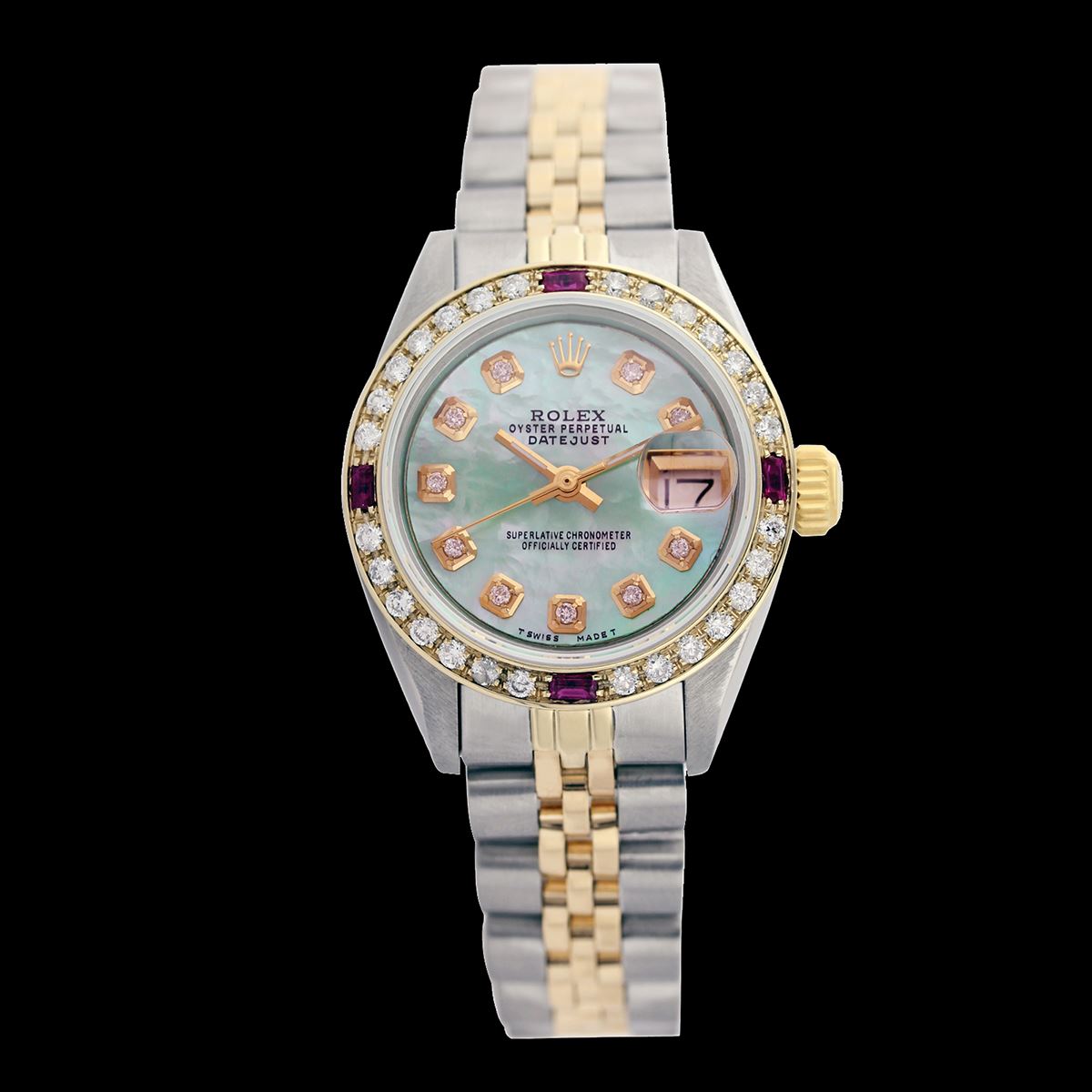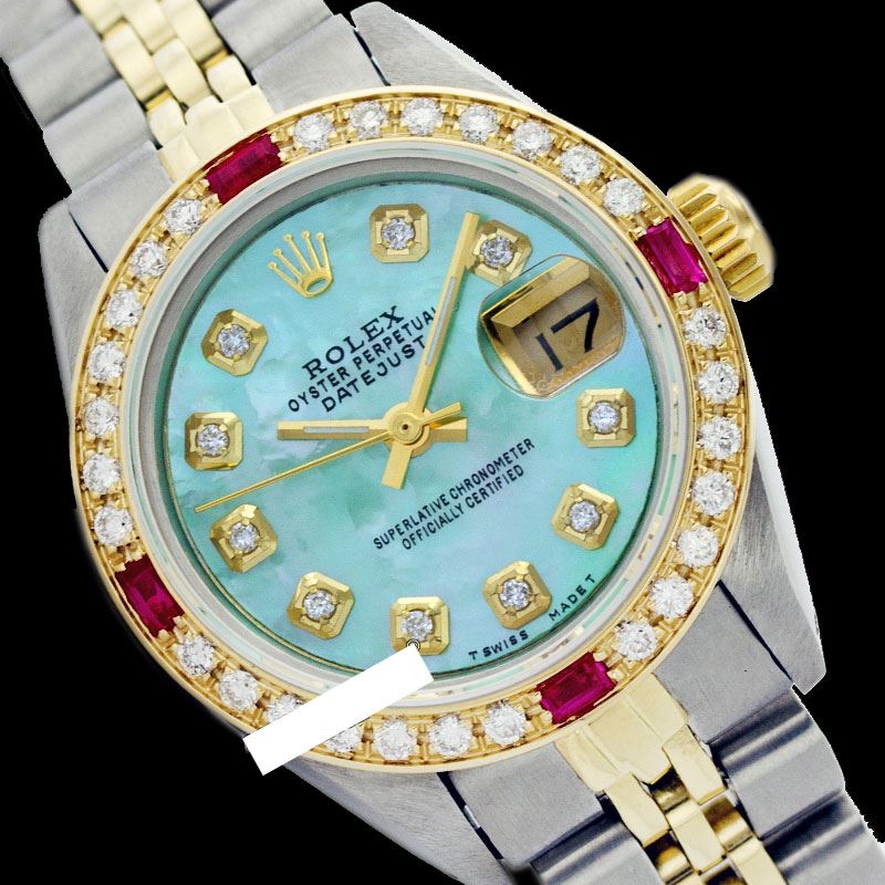 WATCH DETAILS: ITEM: WatchBRAND: RolexTYPE: Two ToneFEATURE: QuickSetMODEL: DateJustMADE: Swiss MadeGENDER: Men'sCONDITION: Pre-OwnedFUNCTION: DateDIAL COLOR: Blue Mother Of PearlHOUR MARKERS: 10 Round Custom Made DiamondBEZEL TYPE: Custom Made Diamond & Ruby BezelBEZEL STONE: Diamond G-VVS1 & 4 Burmise RubyBEZEL MATERIAL: 18K GoldBRACELET TYPE: Jubilee BRACELET MATERIAL: 14K Yellow Gold & Stainless SteelCLASP TYPE: Folding ClaspCLASP MATERIAL: Stainless SteelCASE STONE: CASE SIZE: 36mmCRYSTAL: Scratch Resistance Sapphire CrystalMOVEMENT: Automatic (Self Winding)CALIBER: 3035CROWN TYPE: Screw Down CrownWATER RESISTANCE: Waterproof to 10 ATM/100 meters/330 feetMODEL #: 16013SKU #: AMTJQS54We Buy/Sell/Trade Valuable watches, Please call us