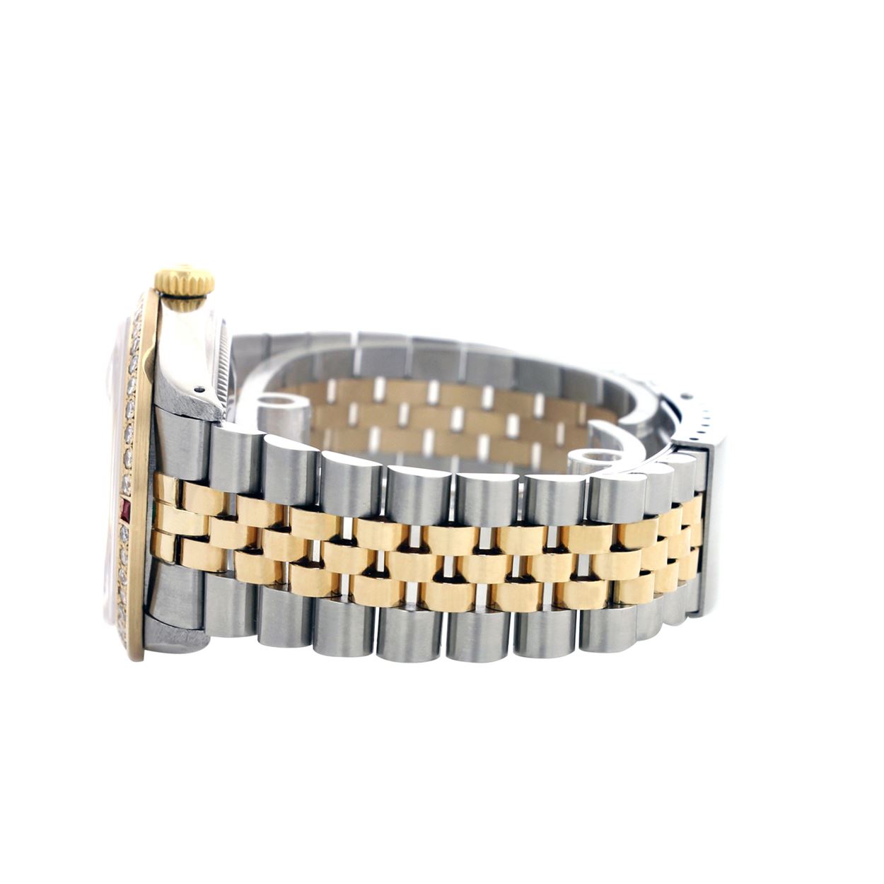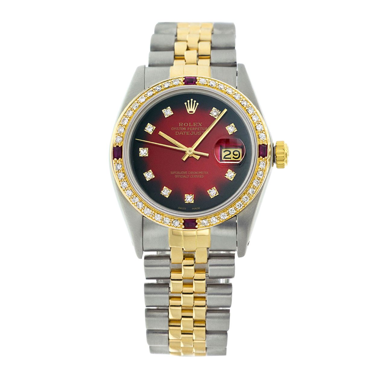 WATCH DETAILS: ITEM: WatchBRAND: RolexTYPE: Two ToneFEATURE: QuickSetMODEL: DateJustMADE: Swiss MadeGENDER: Men'sCONDITION: Pre-OwnedFUNCTION: DateDIAL COLOR: Red Vignette HOUR MARKERS: 10 Round Custom Made DiamondBEZEL TYPE: Custom Made Diamond & Ruby BezelBEZEL STONE: Diamond G-VVS1 & 4 Burmise RubyBEZEL MATERIAL: 18K GoldBRACELET TYPE: Jubilee BRACELET MATERIAL: 14K Yellow Gold & Stainless SteelCLASP TYPE: Folding ClaspCLASP MATERIAL: Stainless SteelCASE STONE: CASE SIZE: 36mmCRYSTAL: Scratch Resistance Sapphire CrystalMOVEMENT: Automatic (Self Winding)CALIBER: 3035CROWN TYPE: Screw Down CrownWATER RESISTANCE: Waterproof to 10 ATM/100 meters/330 feetMODEL #: 16013SKU #: AMTJQS16We Buy/Sell/Trade Valuable watches, Please call us