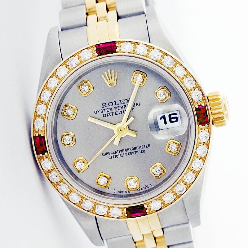 WATCH DETAILS: ITEM: WatchBRAND: RolexTYPE: Two ToneFEATURE: QuickSetMODEL: DateJustMADE: Swiss MadeGENDER: Men'sCONDITION: Pre-OwnedFUNCTION: DateDIAL COLOR: SilverHOUR MARKERS: 10 Round Custom Made DiamondBEZEL TYPE: Custom Made Diamond & Ruby BezelBEZEL STONE: Diamond G-VVS1 & 4 Burmise RubyBEZEL MATERIAL: 18K GoldBRACELET TYPE: Jubilee BRACELET MATERIAL: 14K Yellow Gold & Stainless SteelCLASP TYPE: Folding ClaspCLASP MATERIAL: Stainless SteelCASE STONE: CASE SIZE: 36mmCRYSTAL: Scratch Resistance Sapphire CrystalMOVEMENT: Automatic (Self Winding)CALIBER: 3035CROWN TYPE: Screw Down CrownWATER RESISTANCE: Waterproof to 10 ATM/100 meters/330 feetMODEL #: 16013SKU #: AMTJQS58We Buy/Sell/Trade Valuable watches, Please call us