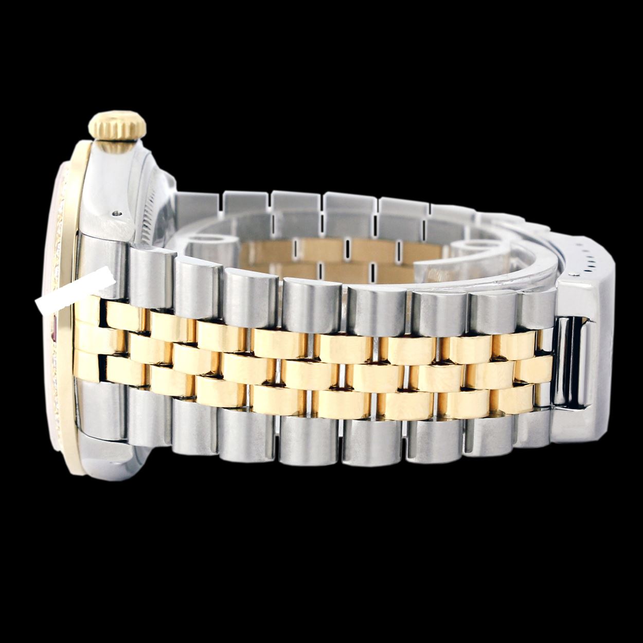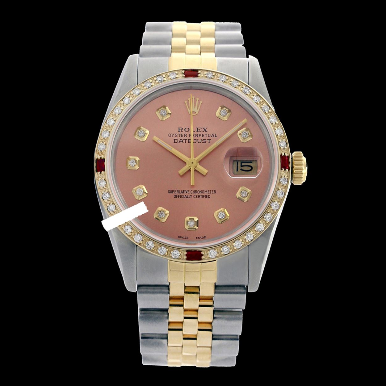 WATCH DETAILS: ITEM: WatchBRAND: RolexTYPE: Two ToneFEATURE: QuickSetMODEL: DateJustMADE: Swiss MadeGENDER: Men'sCONDITION: Pre-OwnedFUNCTION: DateDIAL COLOR: PinkHOUR MARKERS: 10 Round Custom Made DiamondBEZEL TYPE: Custom Made Diamond & Ruby BezelBEZEL STONE: Diamond G-VVS1 & 4 Burmise RubyBEZEL MATERIAL: 18K GoldBRACELET TYPE: Jubilee BRACELET MATERIAL: 14K Yellow Gold & Stainless SteelCLASP TYPE: Folding ClaspCLASP MATERIAL: Stainless SteelCASE STONE: CASE SIZE: 36mmCRYSTAL: Scratch Resistance Sapphire CrystalMOVEMENT: Automatic (Self Winding)CALIBER: 3035CROWN TYPE: Screw Down CrownWATER RESISTANCE: Waterproof to 10 ATM/100 meters/330 feetMODEL #: 16013SKU #: AMTJQS10We Buy/Sell/Trade Valuable watches, Please call us
