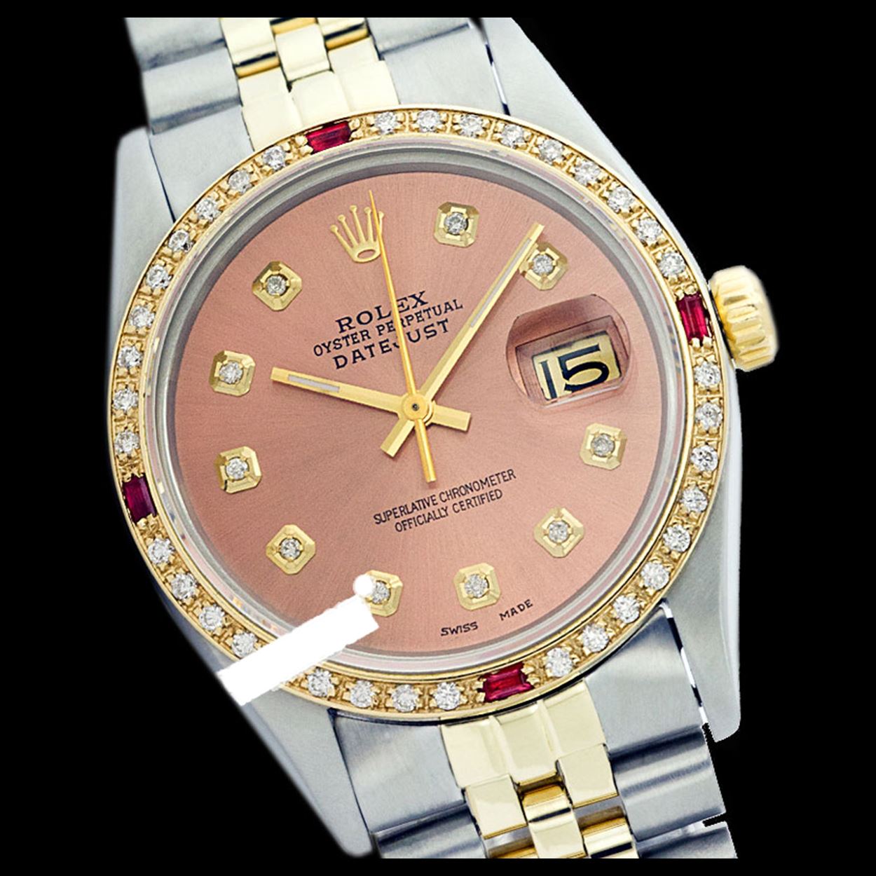 WATCH DETAILS: ITEM: WatchBRAND: RolexTYPE: Two ToneFEATURE: QuickSetMODEL: DateJustMADE: Swiss MadeGENDER: Men'sCONDITION: Pre-OwnedFUNCTION: DateDIAL COLOR: PeachHOUR MARKERS: 10 Round Custom Made DiamondBEZEL TYPE: Custom Made Diamond & Ruby BezelBEZEL STONE: Diamond G-VVS1 & 4 Burmise RubyBEZEL MATERIAL: 18K GoldBRACELET TYPE: Jubilee BRACELET MATERIAL: 14K Yellow Gold & Stainless SteelCLASP TYPE: Folding ClaspCLASP MATERIAL: Stainless SteelCASE STONE: CASE SIZE: 36mmCRYSTAL: Scratch Resistance Sapphire CrystalMOVEMENT: Automatic (Self Winding)CALIBER: 3035CROWN TYPE: Screw Down CrownWATER RESISTANCE: Waterproof to 10 ATM/100 meters/330 feetMODEL #: 16013SKU #: AMTJQS110We Buy/Sell/Trade Valuable watches, Please call us