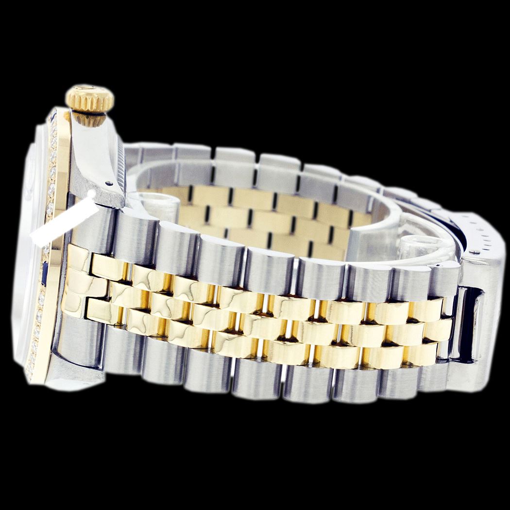 WATCH DETAILS: ITEM: WatchBRAND: RolexTYPE: Two ToneFEATURE: QuickSetMODEL: DateJustMADE: Swiss MadeGENDER: Men'sCONDITION: Pre-OwnedFUNCTION: DateDIAL COLOR: Royal BlueHOUR MARKERS: 10 Round Custom Made DiamondBEZEL TYPE: Custom Made Diamond & Sapphire BezelBEZEL STONE: Diamond G-VVS1 & Ceylon Blue SapphireBEZEL MATERIAL: 18K GoldBRACELET TYPE: Jubilee BRACELET MATERIAL: 14K Yellow Gold & Stainless SteelCLASP TYPE: Folding ClaspCLASP MATERIAL: Stainless SteelCASE STONE: CASE SIZE: 36mmCRYSTAL: Scratch Resistance Sapphire CrystalMOVEMENT: Automatic (Self Winding)CALIBER: 3035CROWN TYPE: Screw Down CrownWATER RESISTANCE: Waterproof to 10 ATM/100 meters/330 feetMODEL #: 16013SKU #: AMTJQS13We Buy/Sell/Trade Valuable watches, Please call us
