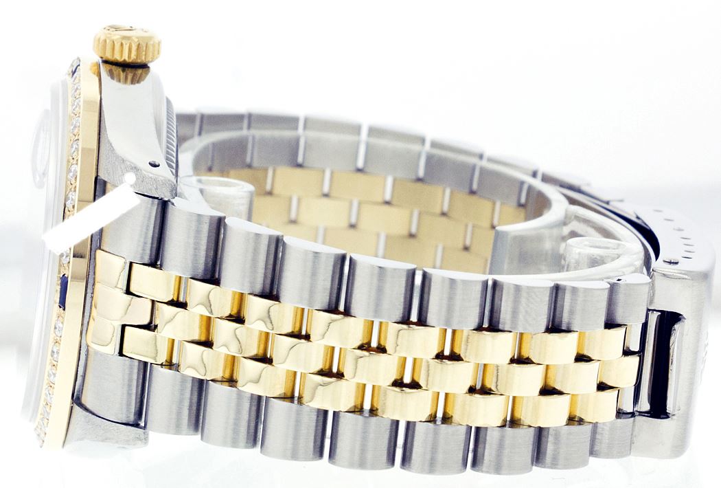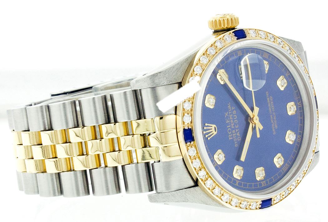 WATCH DETAILS: ITEM: WatchBRAND: RolexTYPE: Two ToneFEATURE: QuickSetMODEL: DateJustMADE: Swiss MadeGENDER: Men'sCONDITION: Pre-OwnedFUNCTION: DateDIAL COLOR: Royal BlueHOUR MARKERS: 10 Round Custom Made DiamondBEZEL TYPE: Custom Made Diamond & Sapphire BezelBEZEL STONE: Diamond G-VVS1 & Ceylon Blue SapphireBEZEL MATERIAL: 18K GoldBRACELET TYPE: Jubilee BRACELET MATERIAL: 14K Yellow Gold & Stainless SteelCLASP TYPE: Folding ClaspCLASP MATERIAL: Stainless SteelCASE STONE: CASE SIZE: 36mmCRYSTAL: Scratch Resistance Sapphire CrystalMOVEMENT: Automatic (Self Winding)CALIBER: 3035CROWN TYPE: Screw Down CrownWATER RESISTANCE: Waterproof to 10 ATM/100 meters/330 feetMODEL #: 16013SKU #: AMTJQS13We Buy/Sell/Trade Valuable watches, Please call us