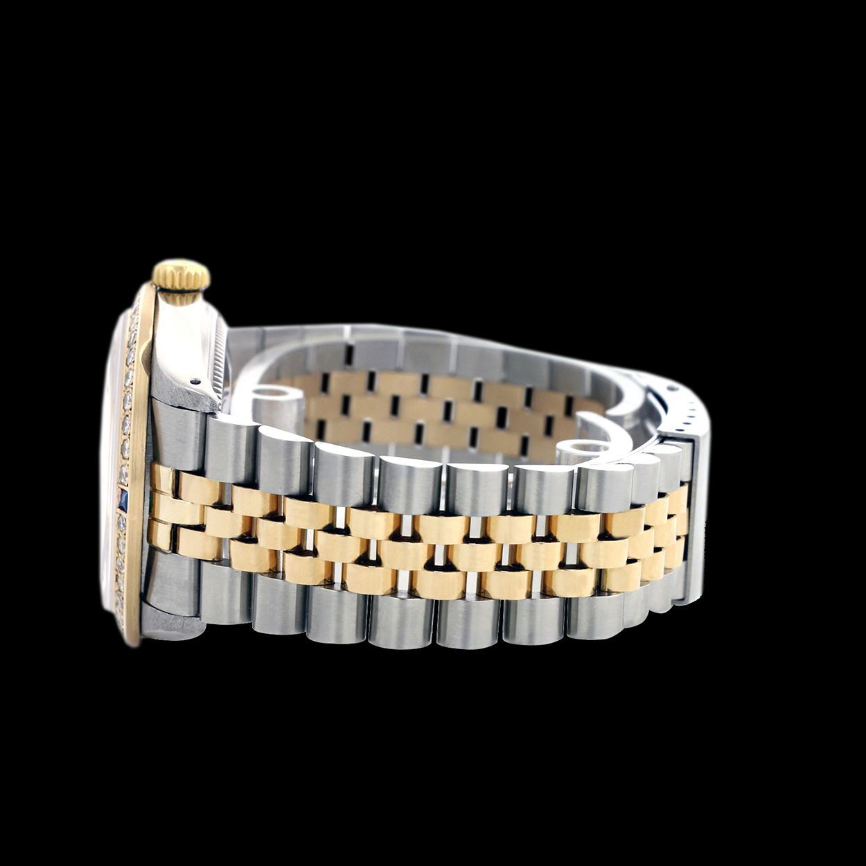 WATCH DETAILS: ITEM: WatchBRAND: RolexTYPE: Two ToneFEATURE: QuickSetMODEL: DateJustMADE: Swiss MadeGENDER: Men'sCONDITION: Pre-OwnedFUNCTION: DateDIAL COLOR: BlueHOUR MARKERS: 10 Round Custom Made DiamondBEZEL TYPE: Custom Made Diamond & Sapphire BezelBEZEL STONE: Diamond G-VVS1 & Ceylon Blue SapphireBEZEL MATERIAL: 18K GoldBRACELET TYPE: Jubilee BRACELET MATERIAL: 14K Yellow Gold & Stainless SteelCLASP TYPE: Folding ClaspCLASP MATERIAL: Stainless SteelCASE STONE: CASE SIZE: 36mmCRYSTAL: Scratch Resistance Sapphire CrystalMOVEMENT: Automatic (Self Winding)CALIBER: 3035CROWN TYPE: Screw Down CrownWATER RESISTANCE: Waterproof to 10 ATM/100 meters/330 feetMODEL #: 16013SKU #: AMTJQS77We Buy/Sell/Trade Valuable watches, Please call us