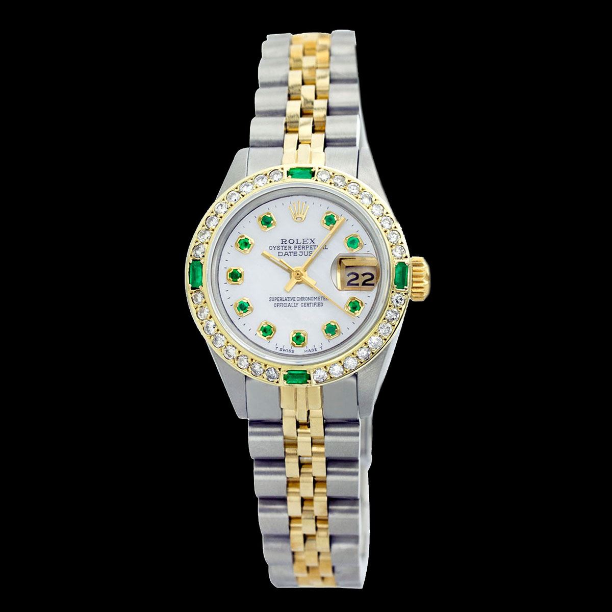 WATCH DETAILS: ITEM: WatchBRAND: RolexTYPE: Two ToneFEATURE: QuickSetMODEL: DateJustMADE: Swiss MadeGENDER: Men'sCONDITION: Pre-OwnedFUNCTION: DateDIAL COLOR: whiteHOUR MARKERS: 10 Round EmeraldBEZEL TYPE: Custom Made Diamond & Emerald BezelBEZEL STONE: Diamond G-VVS1 & 4 Colombian EmeraldBEZEL MATERIAL: 18K GoldBRACELET TYPE: Jubilee BRACELET MATERIAL: 14K Yellow Gold & Stainless SteelCLASP TYPE: Folding ClaspCLASP MATERIAL: Stainless SteelCASE STONE: CASE SIZE: 36mmCRYSTAL: Scratch Resistance Sapphire CrystalMOVEMENT: Automatic (Self Winding)CALIBER: 3035CROWN TYPE: Screw Down CrownWATER RESISTANCE: Waterproof to 10 ATM/100 meters/330 feetMODEL #: 16013SKU #: AMTJQS82We Buy/Sell/Trade Valuable watches, Please call us