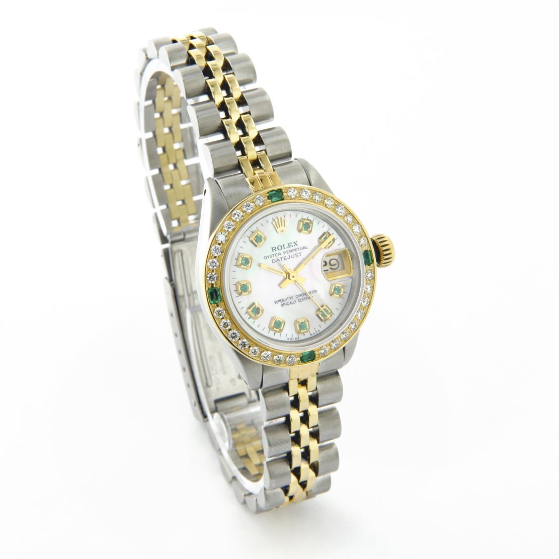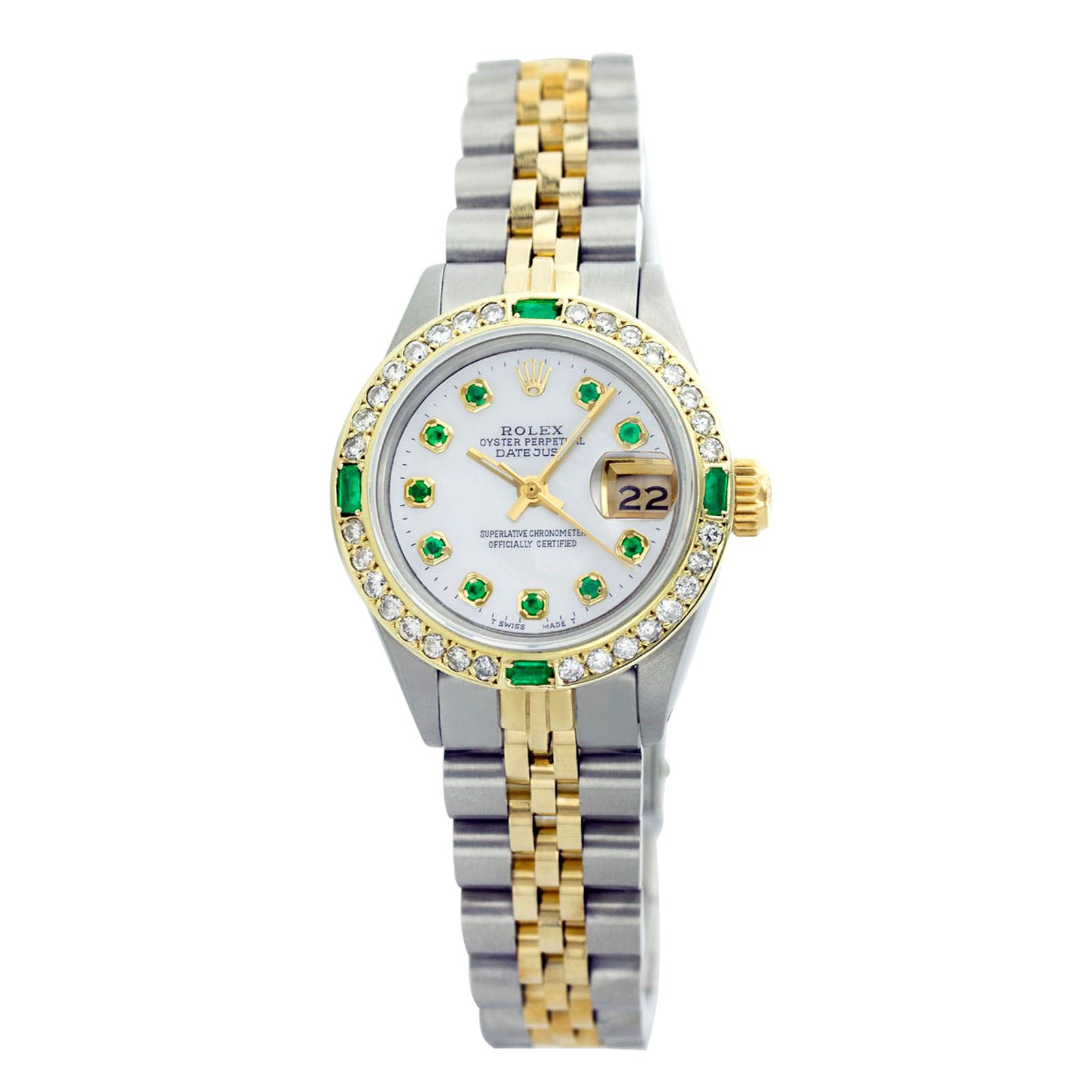 WATCH DETAILS: ITEM: WatchBRAND: RolexTYPE: Two ToneFEATURE: QuickSetMODEL: DateJustMADE: Swiss MadeGENDER: Men'sCONDITION: Pre-OwnedFUNCTION: DateDIAL COLOR: whiteHOUR MARKERS: 10 Round EmeraldBEZEL TYPE: Custom Made Diamond & Emerald BezelBEZEL STONE: Diamond G-VVS1 & 4 Colombian EmeraldBEZEL MATERIAL: 18K GoldBRACELET TYPE: Jubilee BRACELET MATERIAL: 14K Yellow Gold & Stainless SteelCLASP TYPE: Folding ClaspCLASP MATERIAL: Stainless SteelCASE STONE: CASE SIZE: 36mmCRYSTAL: Scratch Resistance Sapphire CrystalMOVEMENT: Automatic (Self Winding)CALIBER: 3035CROWN TYPE: Screw Down CrownWATER RESISTANCE: Waterproof to 10 ATM/100 meters/330 feetMODEL #: 16013SKU #: AMTJQS82We Buy/Sell/Trade Valuable watches, Please call us