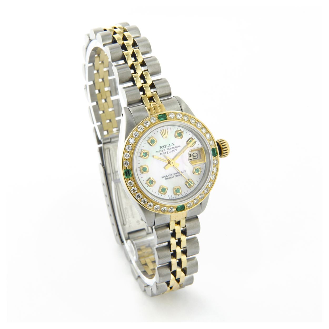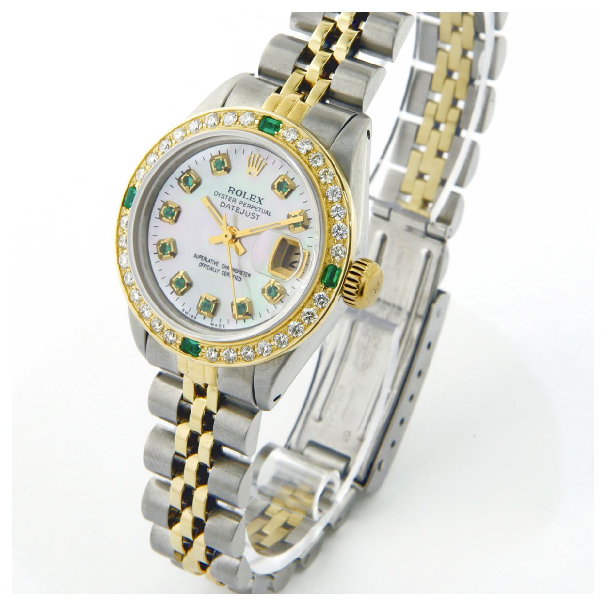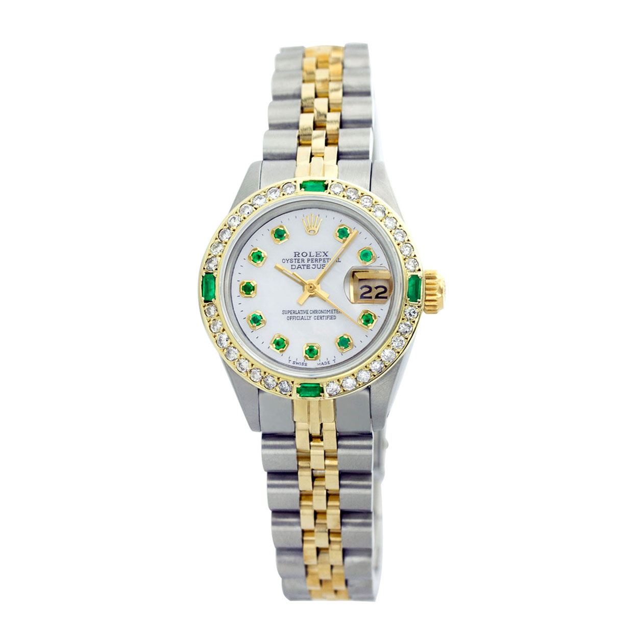 WATCH DETAILS: ITEM: WatchBRAND: RolexTYPE: Two ToneFEATURE: QuickSetMODEL: DateJustMADE: Swiss MadeGENDER: Men'sCONDITION: Pre-OwnedFUNCTION: DateDIAL COLOR: whiteHOUR MARKERS: 10 Round EmeraldBEZEL TYPE: Custom Made Diamond & Emerald BezelBEZEL STONE: Diamond G-VVS1 & 4 Colombian EmeraldBEZEL MATERIAL: 18K GoldBRACELET TYPE: Jubilee BRACELET MATERIAL: 14K Yellow Gold & Stainless SteelCLASP TYPE: Folding ClaspCLASP MATERIAL: Stainless SteelCASE STONE: CASE SIZE: 36mmCRYSTAL: Scratch Resistance Sapphire CrystalMOVEMENT: Automatic (Self Winding)CALIBER: 3035CROWN TYPE: Screw Down CrownWATER RESISTANCE: Waterproof to 10 ATM/100 meters/330 feetMODEL #: 16013SKU #: AMTJQS82We Buy/Sell/Trade Valuable watches, Please call us