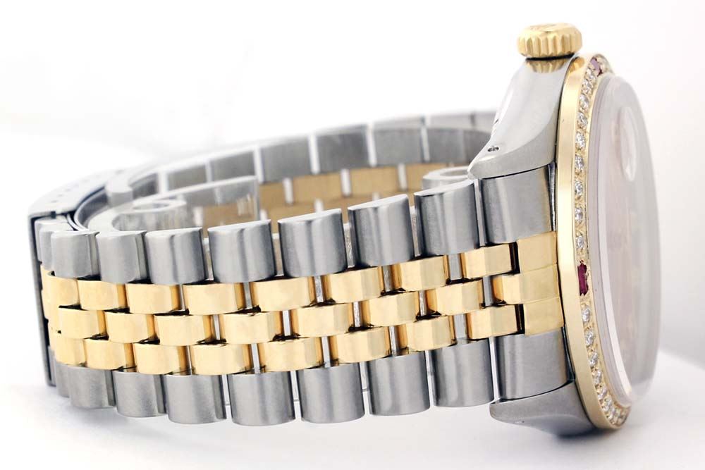 WATCH DETAILS: ITEM: WatchBRAND: RolexTYPE: Two ToneFEATURE: QuickSetMODEL: DateJustMADE: Swiss MadeGENDER: Men'sCONDITION: Pre-OwnedFUNCTION: DateDIAL COLOR: GoldHOUR MARKERS: Full Custom Made Diamond PaveBEZEL TYPE: Custom Made Diamond & Ruby BezelBEZEL STONE: Diamond G-VVS1 & 4 Burmise RubyBEZEL MATERIAL: 18K GoldBRACELET TYPE: Jubilee BRACELET MATERIAL: 14K Yellow Gold & Stainless SteelCLASP TYPE: Folding ClaspCLASP MATERIAL: Stainless SteelCASE STONE: CASE SIZE: 36mmCRYSTAL: Scratch Resistance Sapphire CrystalMOVEMENT: Automatic (Self Winding)CALIBER: 3035CROWN TYPE: Screw Down CrownWATER RESISTANCE: Waterproof to 10 ATM/100 meters/330 feetMODEL #: 16013SKU #: AMTJQS80We Buy/Sell/Trade Valuable watches, Please call us