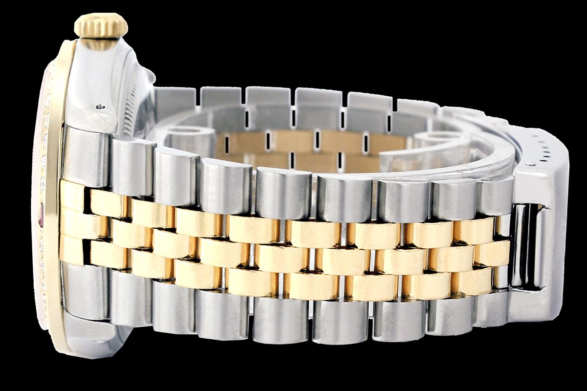 WATCH DETAILS: ITEM: WatchBRAND: RolexTYPE: Two ToneFEATURE: QuickSetMODEL: DateJustMADE: Swiss MadeGENDER: Men'sCONDITION: Pre-OwnedFUNCTION: DateDIAL COLOR: GoldHOUR MARKERS: Full Custom Made Diamond PaveBEZEL TYPE: Custom Made Diamond & Ruby BezelBEZEL STONE: Diamond G-VVS1 & 4 Burmise RubyBEZEL MATERIAL: 18K GoldBRACELET TYPE: Jubilee BRACELET MATERIAL: 14K Yellow Gold & Stainless SteelCLASP TYPE: Folding ClaspCLASP MATERIAL: Stainless SteelCASE STONE: CASE SIZE: 36mmCRYSTAL: Scratch Resistance Sapphire CrystalMOVEMENT: Automatic (Self Winding)CALIBER: 3035CROWN TYPE: Screw Down CrownWATER RESISTANCE: Waterproof to 10 ATM/100 meters/330 feetMODEL #: 16013SKU #: AMTJQS80We Buy/Sell/Trade Valuable watches, Please call us