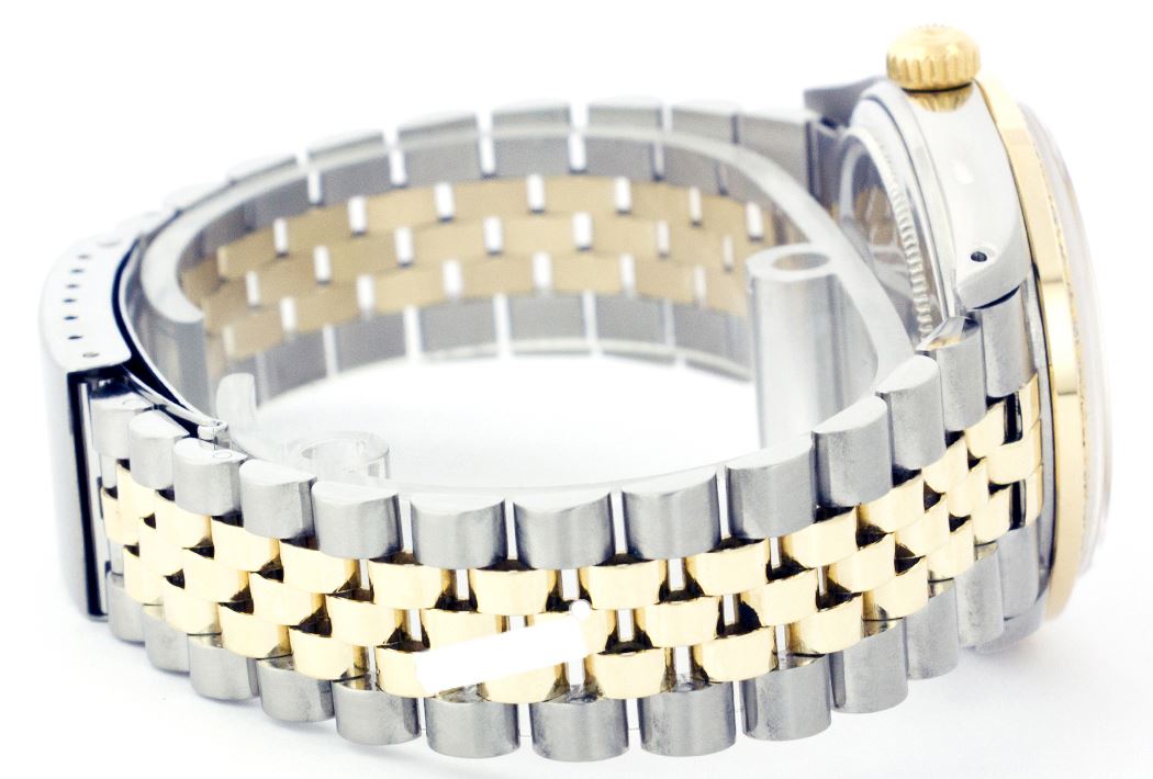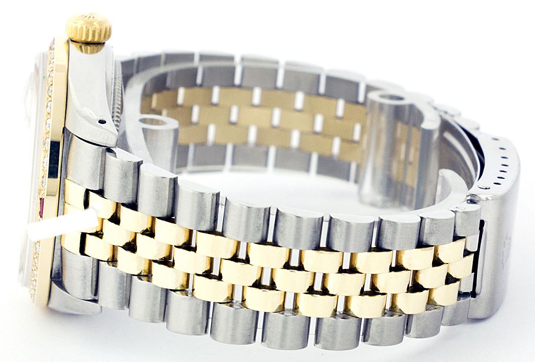 WATCH DETAILS: ITEM: WatchBRAND: RolexTYPE: Two ToneFEATURE: QuickSetMODEL: DateJustMADE: Swiss MadeGENDER: Men'sCONDITION: Pre-OwnedFUNCTION: DateDIAL COLOR: GoldHOUR MARKERS: Full Custom Made Diamond PaveBEZEL TYPE: Custom Made Diamond & Ruby BezelBEZEL STONE: Diamond G-VVS1 & 4 Burmise RubyBEZEL MATERIAL: 18K GoldBRACELET TYPE: Jubilee BRACELET MATERIAL: 14K Yellow Gold & Stainless SteelCLASP TYPE: Folding ClaspCLASP MATERIAL: Stainless SteelCASE STONE: CASE SIZE: 36mmCRYSTAL: Scratch Resistance Sapphire CrystalMOVEMENT: Automatic (Self Winding)CALIBER: 3035CROWN TYPE: Screw Down CrownWATER RESISTANCE: Waterproof to 10 ATM/100 meters/330 feetMODEL #: 16013SKU #: AMTJQS109We Buy/Sell/Trade Valuable watches, Please call us