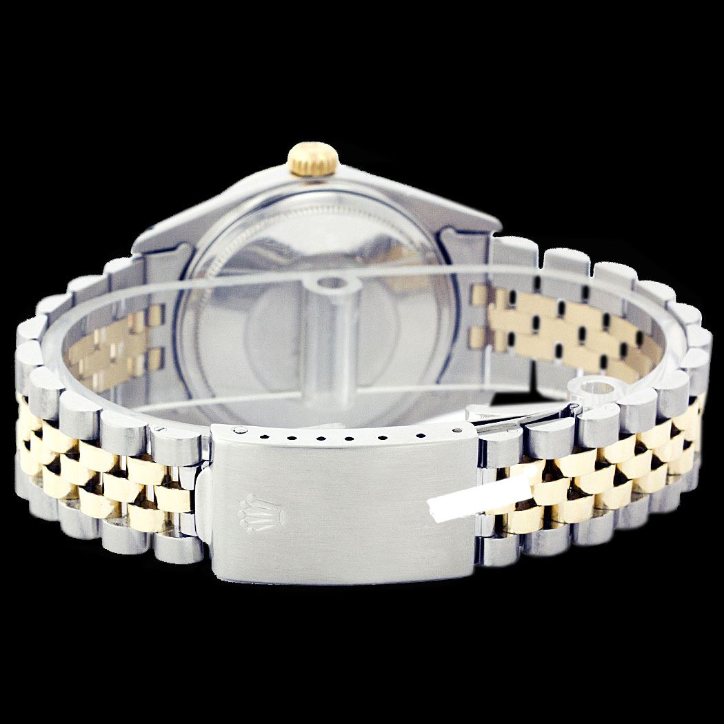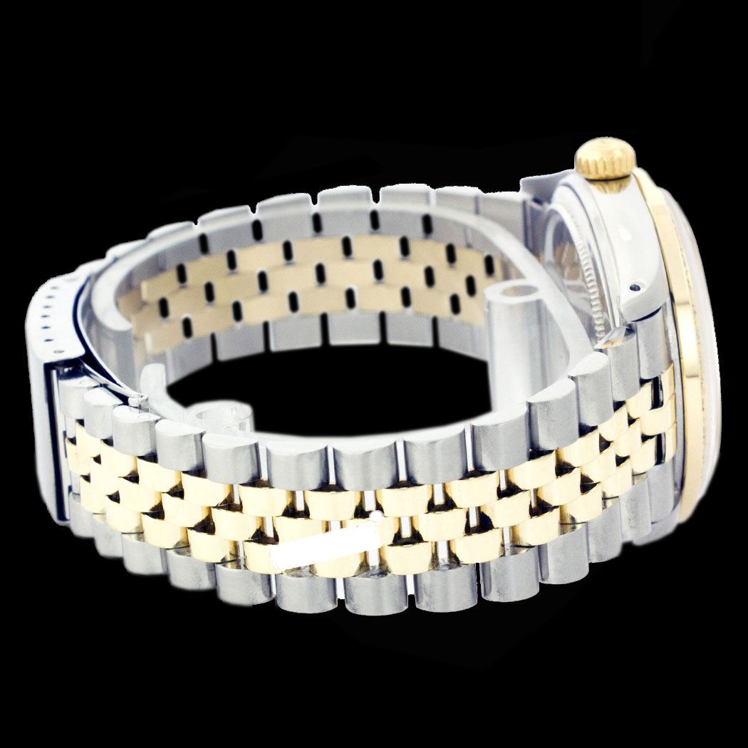 WATCH DETAILS: ITEM: WatchBRAND: RolexTYPE: Two ToneFEATURE: QuickSetMODEL: DateJustMADE: Swiss MadeGENDER: Men'sCONDITION: Pre-OwnedFUNCTION: DateDIAL COLOR: GoldHOUR MARKERS: Full Custom Made Diamond PaveBEZEL TYPE: Custom Made Diamond & Ruby BezelBEZEL STONE: Diamond G-VVS1 & 4 Burmise RubyBEZEL MATERIAL: 18K GoldBRACELET TYPE: Jubilee BRACELET MATERIAL: 14K Yellow Gold & Stainless SteelCLASP TYPE: Folding ClaspCLASP MATERIAL: Stainless SteelCASE STONE: CASE SIZE: 36mmCRYSTAL: Scratch Resistance Sapphire CrystalMOVEMENT: Automatic (Self Winding)CALIBER: 3035CROWN TYPE: Screw Down CrownWATER RESISTANCE: Waterproof to 10 ATM/100 meters/330 feetMODEL #: 16013SKU #: AMTJQS109We Buy/Sell/Trade Valuable watches, Please call us