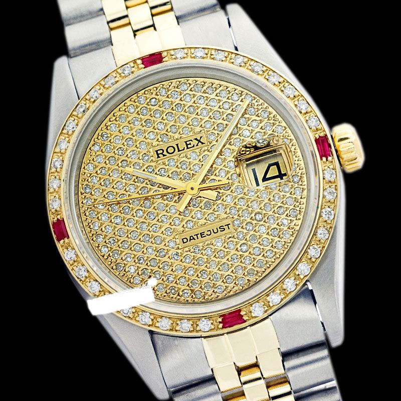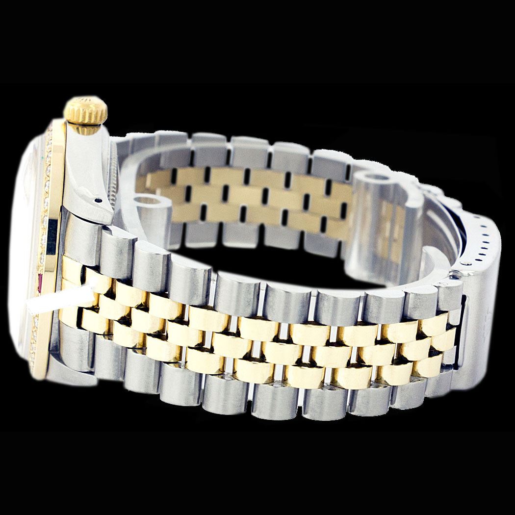 WATCH DETAILS: ITEM: WatchBRAND: RolexTYPE: Two ToneFEATURE: QuickSetMODEL: DateJustMADE: Swiss MadeGENDER: Men'sCONDITION: Pre-OwnedFUNCTION: DateDIAL COLOR: GoldHOUR MARKERS: Full Custom Made Diamond PaveBEZEL TYPE: Custom Made Diamond & Ruby BezelBEZEL STONE: Diamond G-VVS1 & 4 Burmise RubyBEZEL MATERIAL: 18K GoldBRACELET TYPE: Jubilee BRACELET MATERIAL: 14K Yellow Gold & Stainless SteelCLASP TYPE: Folding ClaspCLASP MATERIAL: Stainless SteelCASE STONE: CASE SIZE: 36mmCRYSTAL: Scratch Resistance Sapphire CrystalMOVEMENT: Automatic (Self Winding)CALIBER: 3035CROWN TYPE: Screw Down CrownWATER RESISTANCE: Waterproof to 10 ATM/100 meters/330 feetMODEL #: 16013SKU #: AMTJQS109We Buy/Sell/Trade Valuable watches, Please call us
