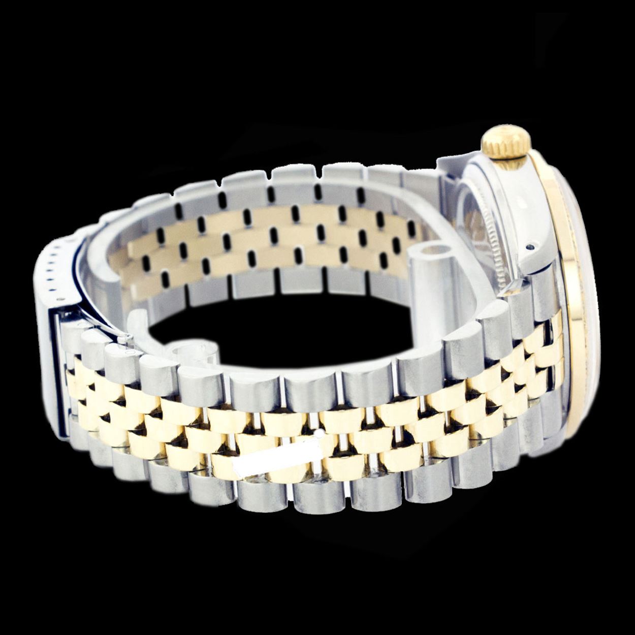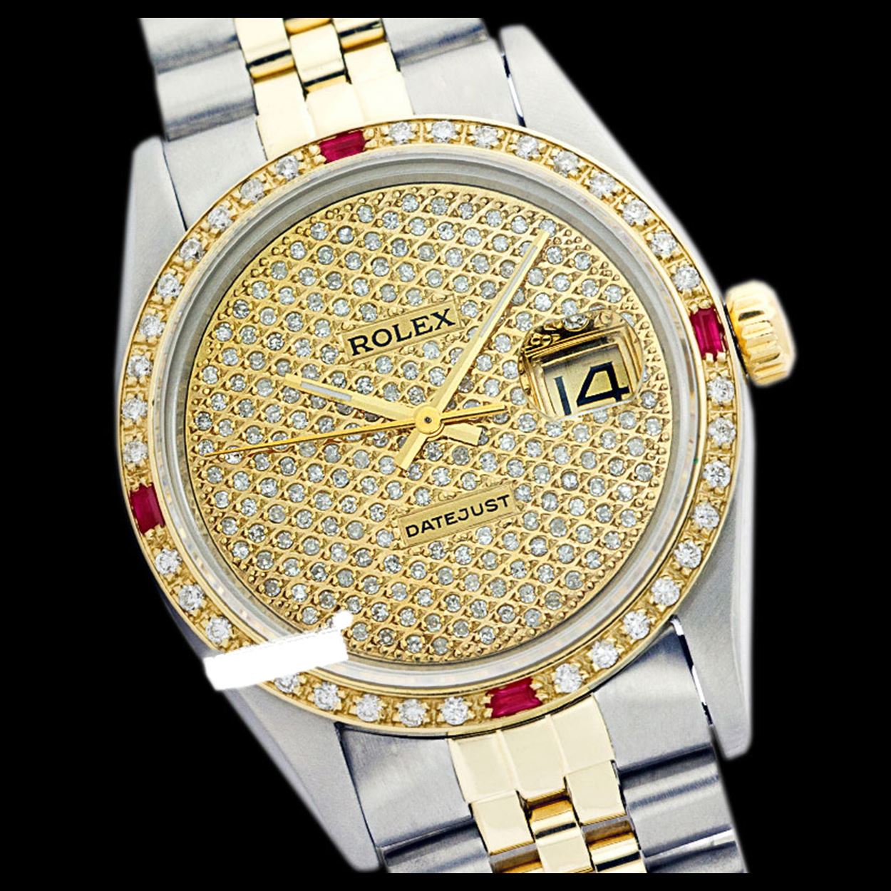 WATCH DETAILS: ITEM: WatchBRAND: RolexTYPE: Two ToneFEATURE: QuickSetMODEL: DateJustMADE: Swiss MadeGENDER: Men'sCONDITION: Pre-OwnedFUNCTION: DateDIAL COLOR: GoldHOUR MARKERS: Full Custom Made Diamond PaveBEZEL TYPE: Custom Made Diamond & Ruby BezelBEZEL STONE: Diamond G-VVS1 & 4 Burmise RubyBEZEL MATERIAL: 18K GoldBRACELET TYPE: Jubilee BRACELET MATERIAL: 14K Yellow Gold & Stainless SteelCLASP TYPE: Folding ClaspCLASP MATERIAL: Stainless SteelCASE STONE: CASE SIZE: 36mmCRYSTAL: Scratch Resistance Sapphire CrystalMOVEMENT: Automatic (Self Winding)CALIBER: 3035CROWN TYPE: Screw Down CrownWATER RESISTANCE: Waterproof to 10 ATM/100 meters/330 feetMODEL #: 16013SKU #: AMTJQS109We Buy/Sell/Trade Valuable watches, Please call us