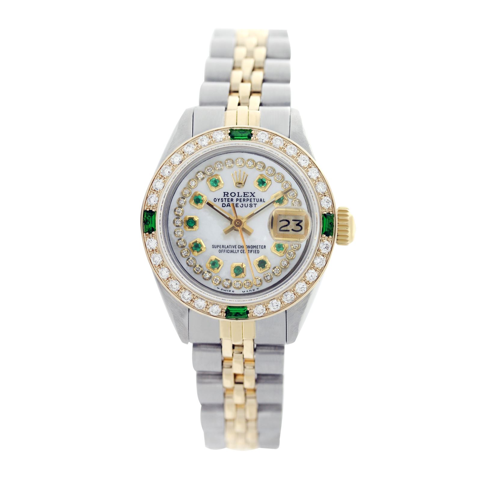 WATCH DETAILS: ITEM: WatchBRAND: RolexTYPE: Two ToneFEATURE: QuickSetMODEL: DateJustMADE: Swiss MadeGENDER: Men'sCONDITION: Pre-OwnedFUNCTION: DateDIAL COLOR: whiteHOUR MARKERS: String Custom Made Diamond + 10 Round RubyBEZEL TYPE: Custom Made Diamond & Emerald BezelBEZEL STONE: Diamond G-VVS1 & 4 Colombian EmeraldBEZEL MATERIAL: 18K GoldBRACELET TYPE: Jubilee BRACELET MATERIAL: 14K Yellow Gold & Stainless SteelCLASP TYPE: Folding ClaspCLASP MATERIAL: Stainless SteelCASE STONE: CASE SIZE: 36mmCRYSTAL: Scratch Resistance Sapphire CrystalMOVEMENT: Automatic (Self Winding)CALIBER: 3035CROWN TYPE: Screw Down CrownWATER RESISTANCE: Waterproof to 10 ATM/100 meters/330 feetMODEL #: 16013SKU #: AMTJQS83We Buy/Sell/Trade Valuable watches, Please call us