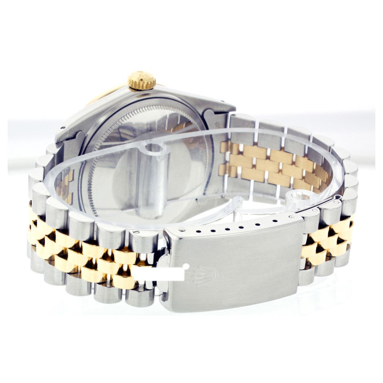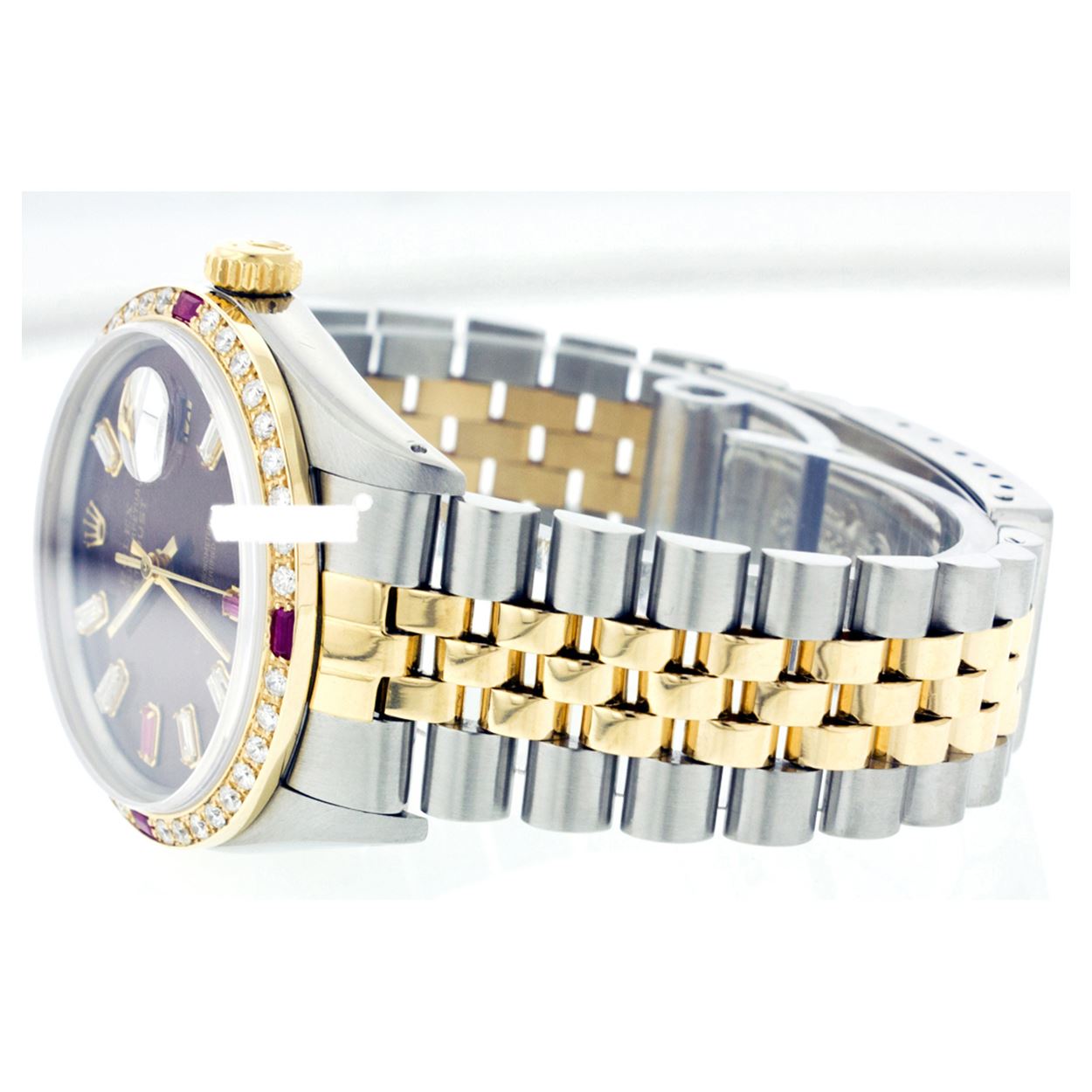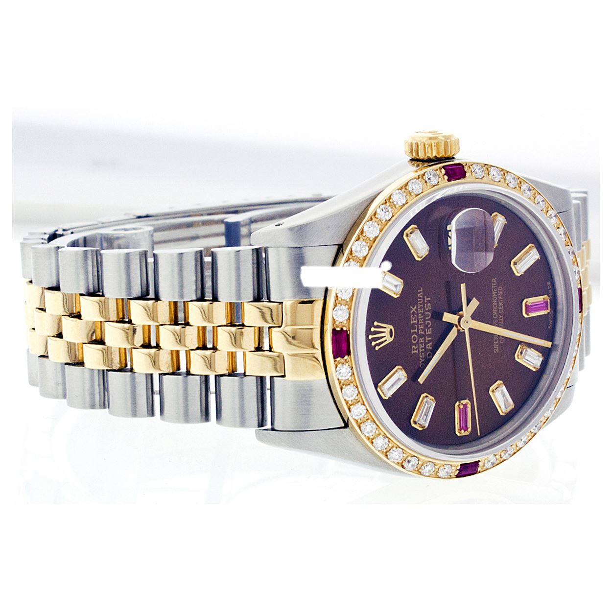 WATCH DETAILS: ITEM: WatchBRAND: RolexTYPE: Two ToneFEATURE: QuickSetMODEL: DateJustMADE: Swiss MadeGENDER: Men'sCONDITION: Pre-OwnedFUNCTION: DateDIAL COLOR: BrownHOUR MARKERS: 10 Custom Made Diamond & Ruby BaguetteBEZEL TYPE: Custom Made Diamond & Ruby BezelBEZEL STONE: Diamond G-VVS1 & 4 Burmise RubyBEZEL MATERIAL: 18K GoldBRACELET TYPE: Jubilee BRACELET MATERIAL: 14K Yellow Gold & Stainless SteelCLASP TYPE: Folding ClaspCLASP MATERIAL: Stainless SteelCASE STONE: CASE SIZE: 36mmCRYSTAL: Scratch Resistance Sapphire CrystalMOVEMENT: Automatic (Self Winding)CALIBER: 3035CROWN TYPE: Screw Down CrownWATER RESISTANCE: Waterproof to 10 ATM/100 meters/330 feetMODEL #: 16013SKU #: AMTJQS12We Buy/Sell/Trade Valuable watches, Please call us