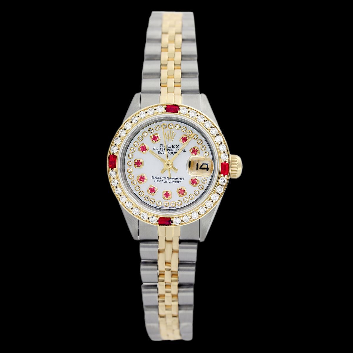 WATCH DETAILS: ITEM: WatchBRAND: RolexTYPE: Two ToneFEATURE: QuickSetMODEL: DateJustMADE: Swiss MadeGENDER: Men'sCONDITION: Pre-OwnedFUNCTION: DateDIAL COLOR: WhiteHOUR MARKERS: String Custom Made Diamond + 10 Round RubyBEZEL TYPE: Custom Made Diamond & Ruby BezelBEZEL STONE: Diamond G-VVS1 & 4 Burmise RubyBEZEL MATERIAL: 18K GoldBRACELET TYPE: Jubilee BRACELET MATERIAL: 14K Yellow Gold & Stainless SteelCLASP TYPE: Folding ClaspCLASP MATERIAL: Stainless SteelCASE STONE: CASE SIZE: 36mmCRYSTAL: Scratch Resistance Sapphire CrystalMOVEMENT: Automatic (Self Winding)CALIBER: 3035CROWN TYPE: Screw Down CrownWATER RESISTANCE: Waterproof to 10 ATM/100 meters/330 feetMODEL #: 16013SKU #: AMTJQS73We Buy/Sell/Trade Valuable watches, Please call us