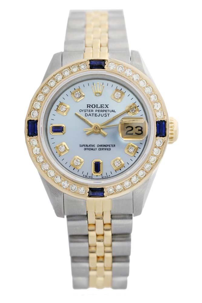 WATCH DETAILS: ITEM: WatchBRAND: RolexTYPE: Two ToneFEATURE: QuickSetMODEL: DateJustMADE: Swiss MadeGENDER: Men'sCONDITION: Pre-OwnedFUNCTION: DateDIAL COLOR: BlueHOUR MARKERS: 8 + 2 , 8 Round Custom Made Diamond & 2 Baguette SapphireBEZEL TYPE: Custom Made Diamond BezelBEZEL STONE: Diamond 1.14 CTW G-VVS1 BEZEL MATERIAL: 18K GoldBRACELET TYPE: Jubilee BRACELET MATERIAL: 14K Yellow Gold & Stainless SteelCLASP TYPE: Folding ClaspCLASP MATERIAL: Stainless SteelCASE STONE: CASE SIZE: 36mmCRYSTAL: Scratch Resistance Sapphire CrystalMOVEMENT: Automatic (Self Winding)CALIBER: 3035CROWN TYPE: Screw Down CrownWATER RESISTANCE: Waterproof to 10 ATM/100 meters/330 feetMODEL #: 16013SKU #: AMTJQS92We Buy/Sell/Trade Valuable watches, Please call us
