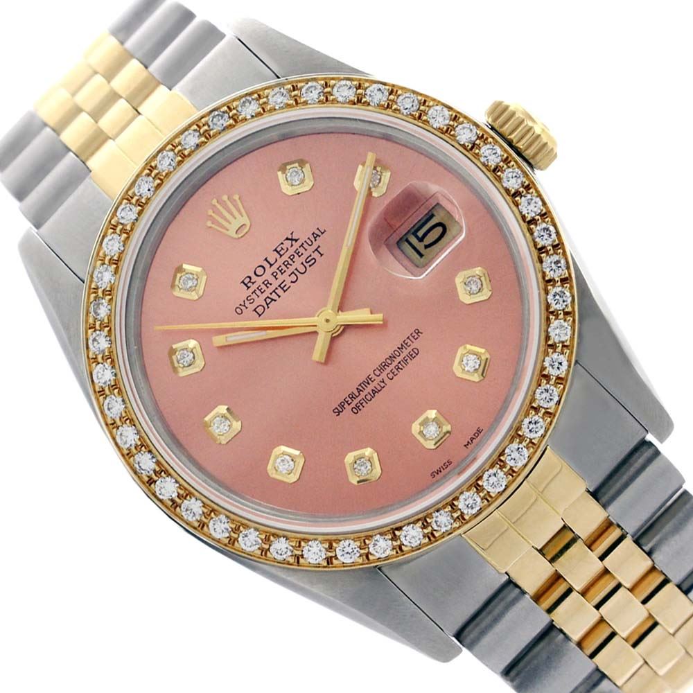 WATCH DETAILS: ITEM: WatchBRAND: RolexTYPE: Two ToneFEATURE: QuickSetMODEL: DateJustMADE: Swiss MadeGENDER: Men'sCONDITION: Pre-OwnedFUNCTION: DateDIAL COLOR: PinkHOUR MARKERS: 10 Round Custom Made DiamondBEZEL TYPE: Custom Made Diamond BezelBEZEL STONE: Diamond 1.14 CTW G-VVS1 BEZEL MATERIAL: 18K GoldBRACELET TYPE: Jubilee BRACELET MATERIAL: 14K Yellow Gold & Stainless SteelCLASP TYPE: Folding ClaspCLASP MATERIAL: Stainless SteelCASE STONE: CASE SIZE: 36mmCRYSTAL: Scratch Resistance Sapphire CrystalMOVEMENT: Automatic (Self Winding)CALIBER: 3035CROWN TYPE: Screw Down CrownWATER RESISTANCE: Waterproof to 10 ATM/100 meters/330 feetMODEL #: 16013SKU #: AMTJQS72We Buy/Sell/Trade Valuable watches, Please call us