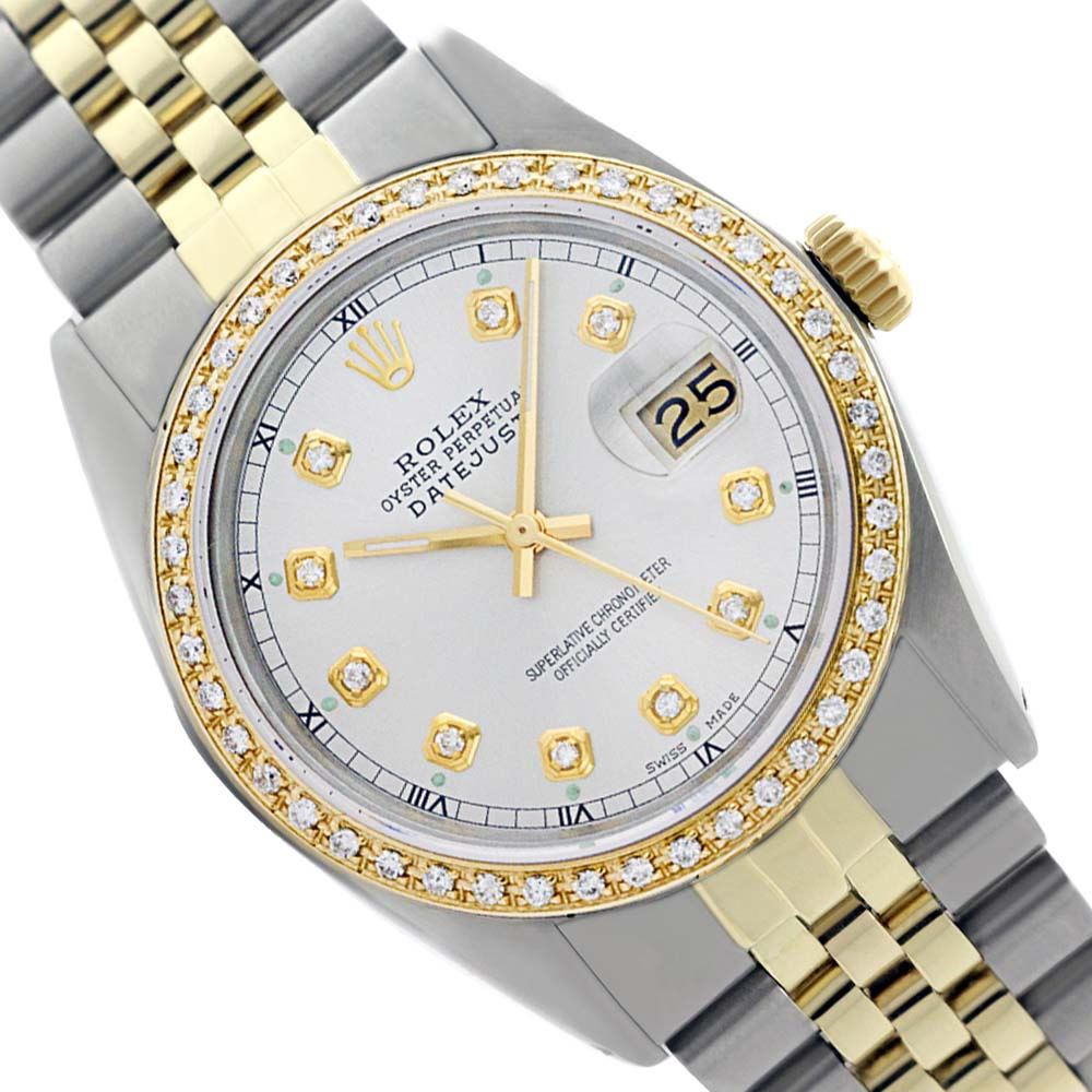 WATCH DETAILS: ITEM: WatchBRAND: RolexTYPE: Two ToneFEATURE: QuickSetMODEL: DateJustMADE: Swiss MadeGENDER: Men'sCONDITION: Pre-OwnedFUNCTION: DateDIAL COLOR: whiteHOUR MARKERS: 10 Round Custom Made DiamondBEZEL TYPE: Custom Made Diamond BezelBEZEL STONE: Diamond 1.14 CTW G-VVS1 BEZEL MATERIAL: 18K GoldBRACELET TYPE: Jubilee BRACELET MATERIAL: 14K Yellow Gold & Stainless SteelCLASP TYPE: Folding ClaspCLASP MATERIAL: Stainless SteelCASE STONE: CASE SIZE: 36mmCRYSTAL: Scratch Resistance Sapphire CrystalMOVEMENT: Automatic (Self Winding)CALIBER: 3035CROWN TYPE: Screw Down CrownWATER RESISTANCE: Waterproof to 10 ATM/100 meters/330 feetMODEL #: 16013SKU #: AMTJQS41We Buy/Sell/Trade Valuable watches, Please call us