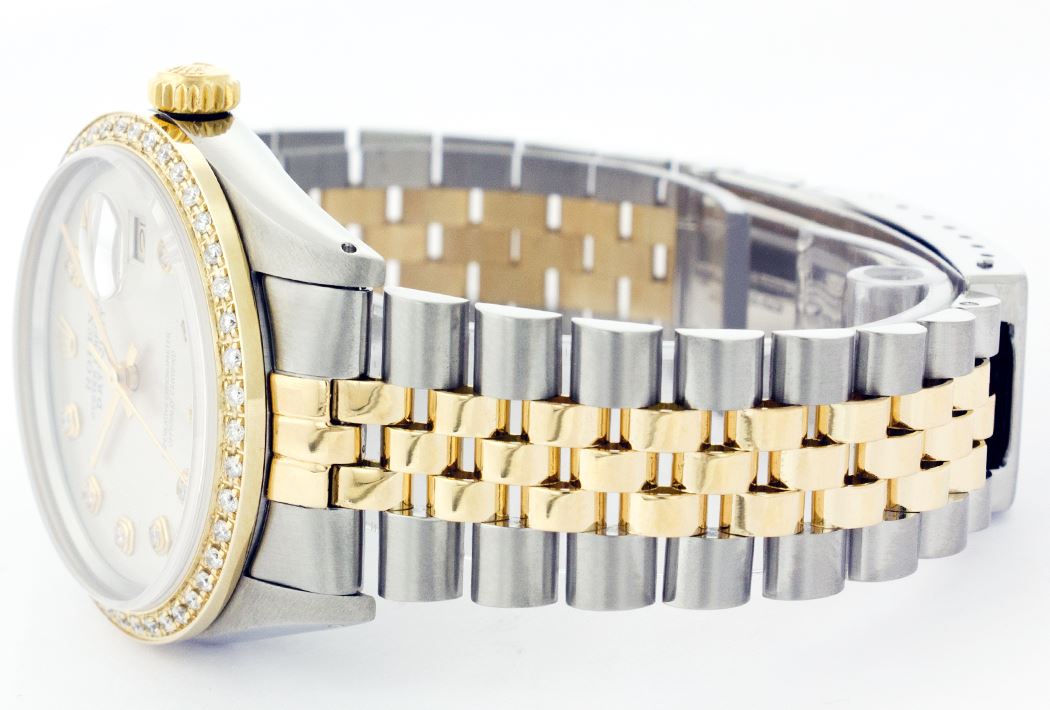 WATCH DETAILS: ITEM: WatchBRAND: RolexTYPE: Two ToneFEATURE: QuickSetMODEL: DateJustMADE: Swiss MadeGENDER: Men'sCONDITION: Pre-OwnedFUNCTION: DateDIAL COLOR: whiteHOUR MARKERS: 10 Round Custom Made DiamondBEZEL TYPE: Custom Made Diamond BezelBEZEL STONE: Diamond 1.14 CTW G-VVS1 BEZEL MATERIAL: 18K GoldBRACELET TYPE: Jubilee BRACELET MATERIAL: 14K Yellow Gold & Stainless SteelCLASP TYPE: Folding ClaspCLASP MATERIAL: Stainless SteelCASE STONE: CASE SIZE: 36mmCRYSTAL: Scratch Resistance Sapphire CrystalMOVEMENT: Automatic (Self Winding)CALIBER: 3035CROWN TYPE: Screw Down CrownWATER RESISTANCE: Waterproof to 10 ATM/100 meters/330 feetMODEL #: 16013SKU #: AMTJQS98We Buy/Sell/Trade Valuable watches, Please call us