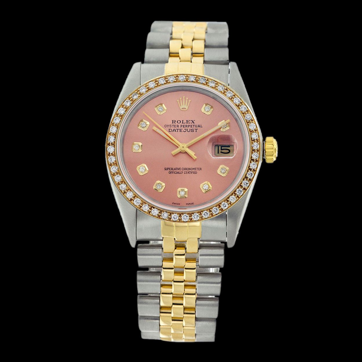 WATCH DETAILS: ITEM: WatchBRAND: RolexTYPE: Two ToneFEATURE: QuickSetMODEL: DateJustMADE: Swiss MadeGENDER: Men'sCONDITION: Pre-OwnedFUNCTION: DateDIAL COLOR: PinkHOUR MARKERS: 10 Round Custom Made DiamondBEZEL TYPE: Custom Made Diamond BezelBEZEL STONE: Diamond 1.14 CTW G-VVS1 BEZEL MATERIAL: 18K GoldBRACELET TYPE: Jubilee BRACELET MATERIAL: 14K Yellow Gold & Stainless SteelCLASP TYPE: Folding ClaspCLASP MATERIAL: Stainless SteelCASE STONE: CASE SIZE: 36mmCRYSTAL: Scratch Resistance Sapphire CrystalMOVEMENT: Automatic (Self Winding)CALIBER: 3035CROWN TYPE: Screw Down CrownWATER RESISTANCE: Waterproof to 10 ATM/100 meters/330 feetMODEL #: 16013SKU #: AMTJQS72We Buy/Sell/Trade Valuable watches, Please call us