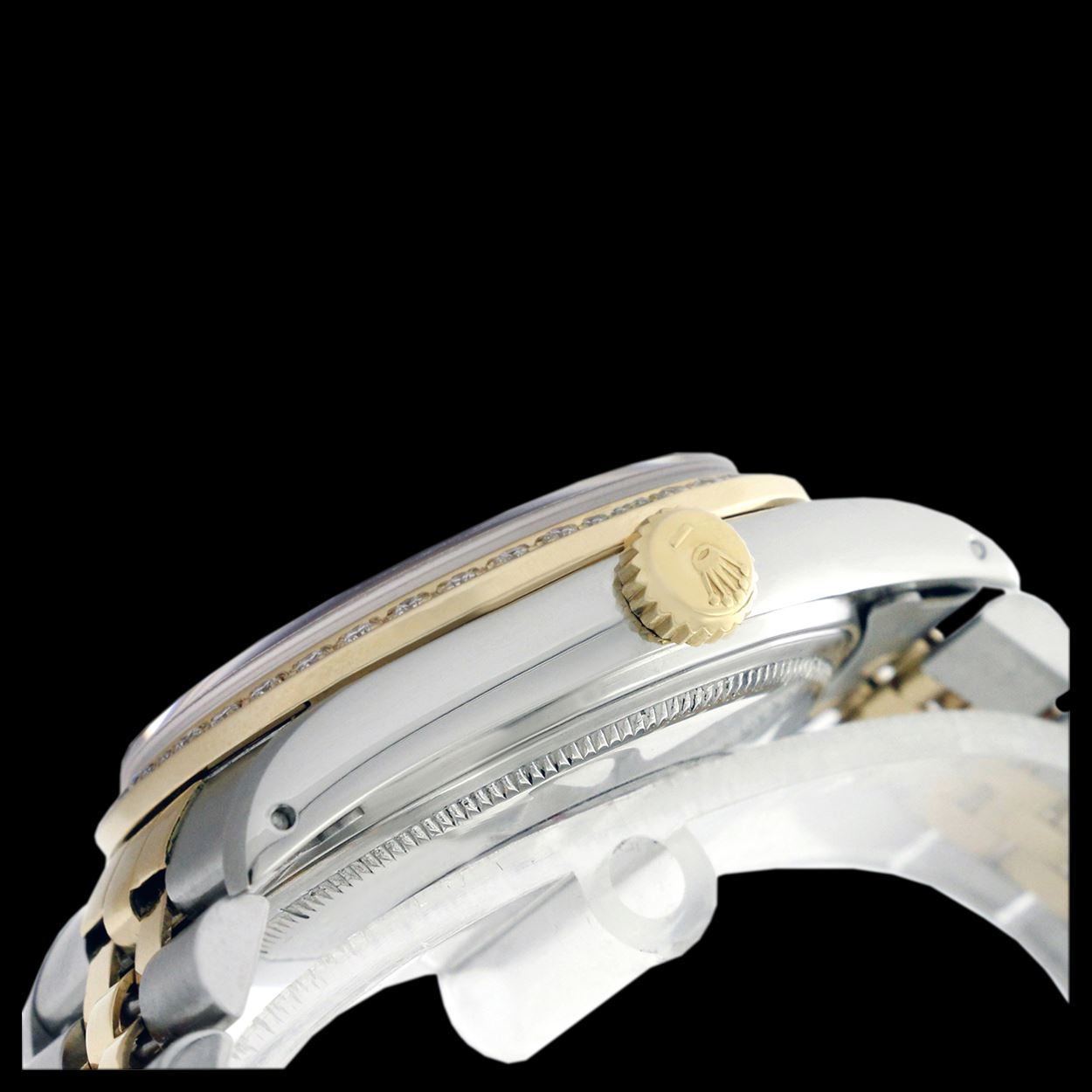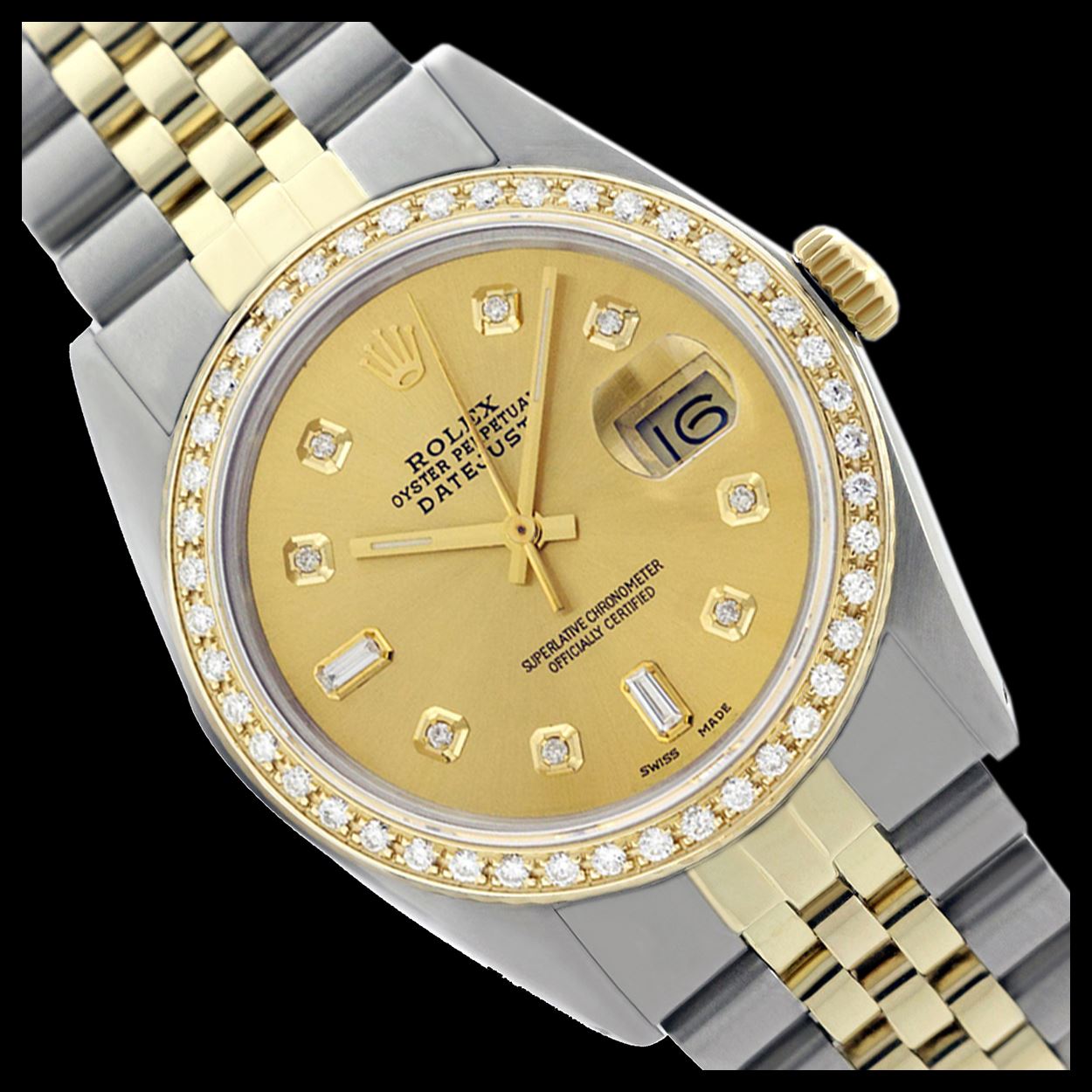 WATCH DETAILS: ITEM: WatchBRAND: RolexTYPE: Two ToneFEATURE: QuickSetMODEL: DateJustMADE: Swiss MadeGENDER: Men'sCONDITION: Pre-OwnedFUNCTION: DateDIAL COLOR: ChampagneHOUR MARKERS: 8 Round Custom Made Diamond and 2 BaguetteBEZEL TYPE: Custom Made Diamond BezelBEZEL STONE: Diamond 1.14 CTW G-VVS1 BEZEL MATERIAL: 18K GoldBRACELET TYPE: Jubilee BRACELET MATERIAL: 14K Yellow Gold & Stainless SteelCLASP TYPE: Folding ClaspCLASP MATERIAL: Stainless SteelCASE STONE: CASE SIZE: 36mmCRYSTAL: Scratch Resistance Sapphire CrystalMOVEMENT: Automatic (Self Winding)CALIBER: 3035CROWN TYPE: Screw Down CrownWATER RESISTANCE: Waterproof to 10 ATM/100 meters/330 feetMODEL #: 16013SKU #: AMTJQS5We Buy/Sell/Trade Valuable watches, Please call us
