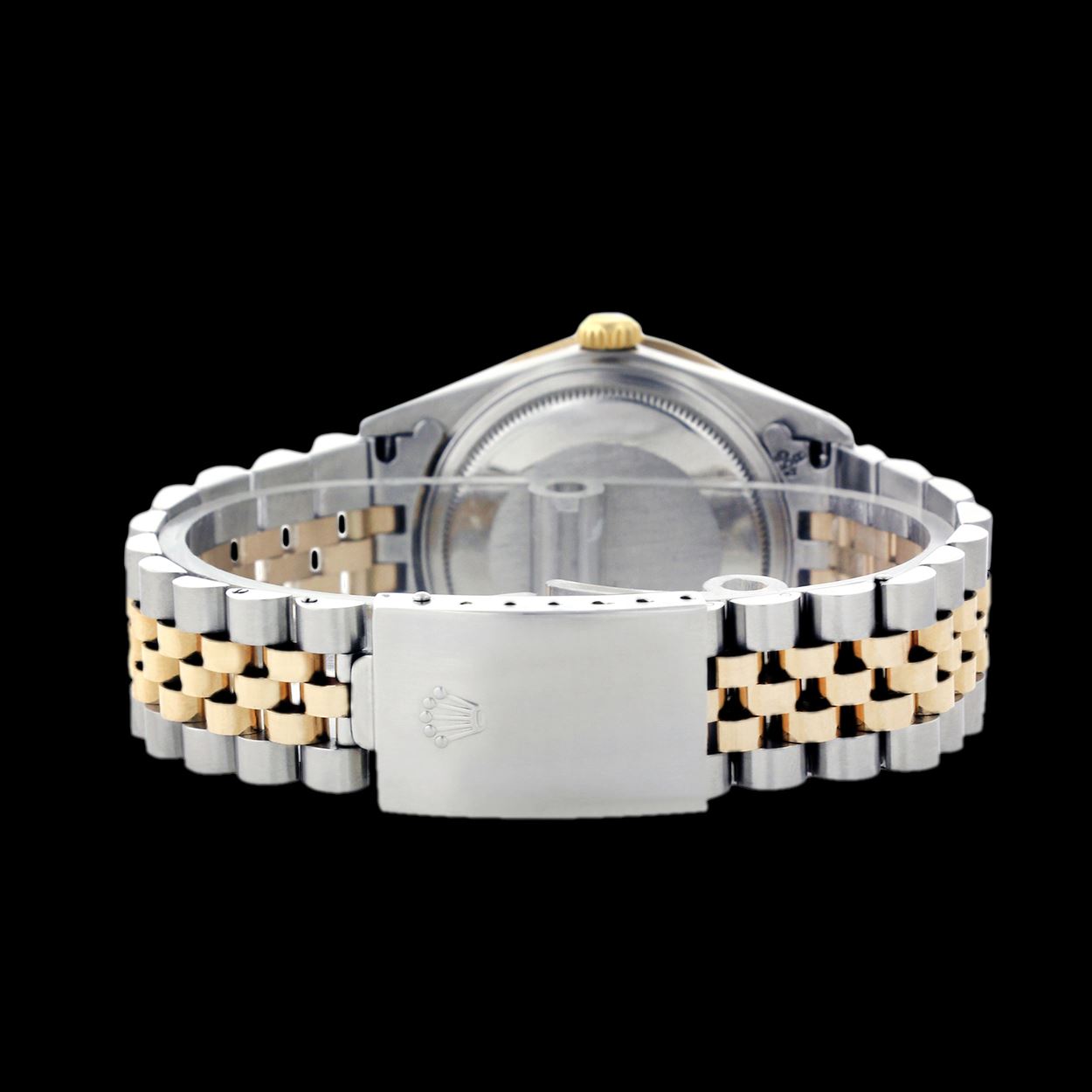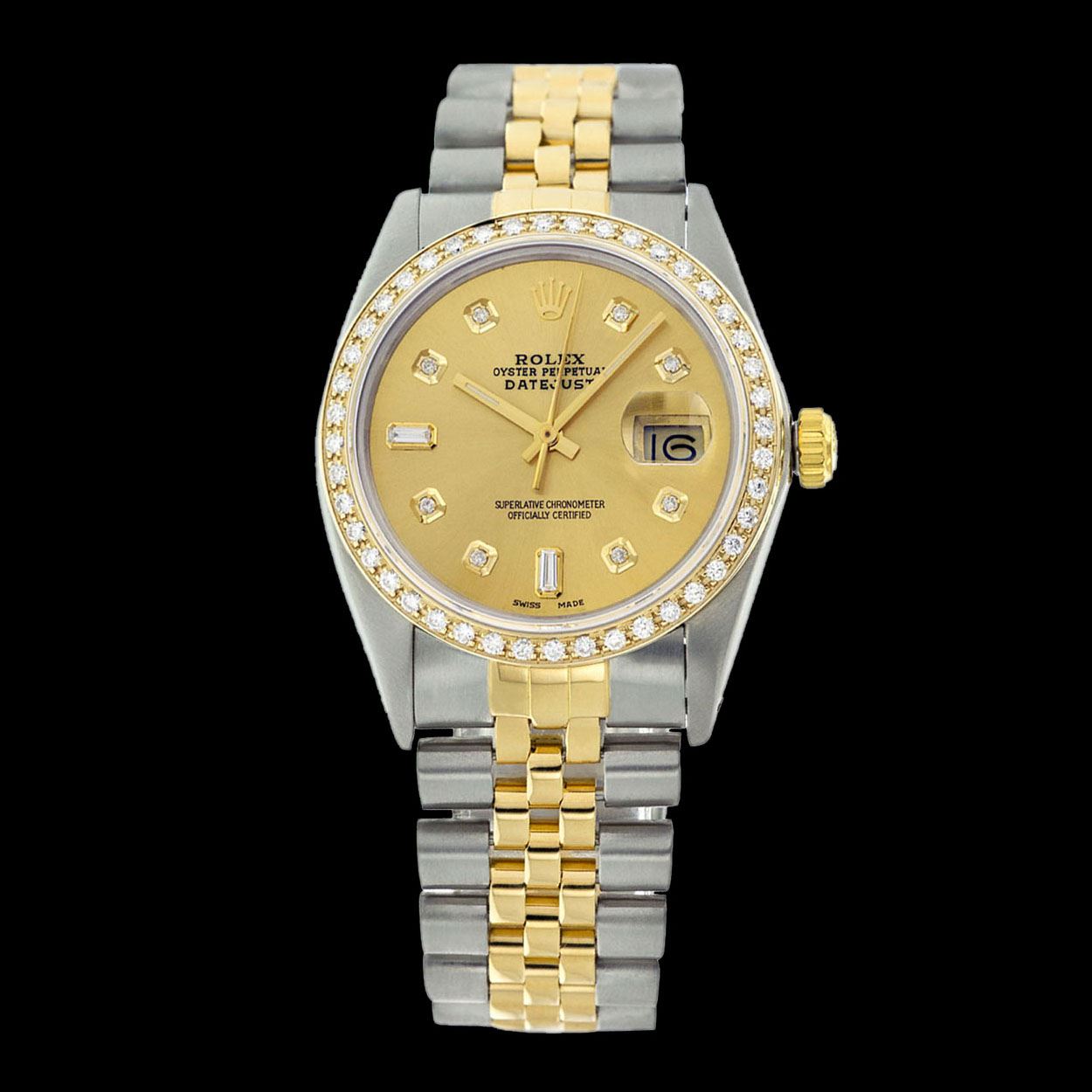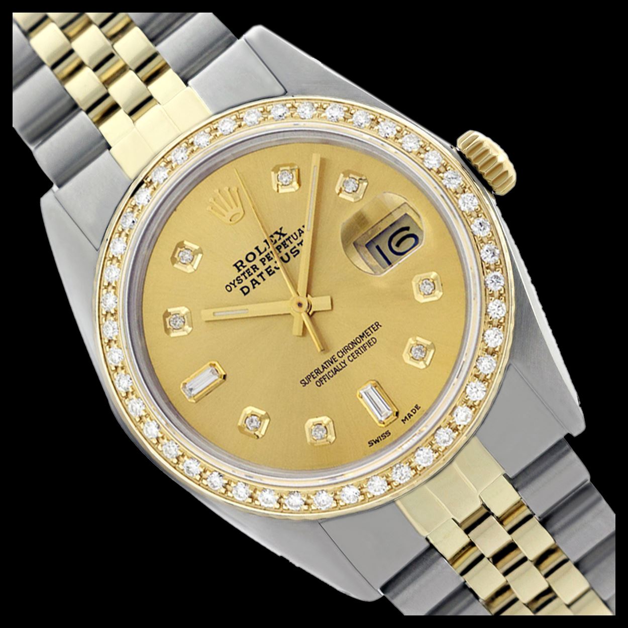 WATCH DETAILS: ITEM: WatchBRAND: RolexTYPE: Two ToneFEATURE: QuickSetMODEL: DateJustMADE: Swiss MadeGENDER: Men'sCONDITION: Pre-OwnedFUNCTION: DateDIAL COLOR: ChampagneHOUR MARKERS: 8 Round & 2 Baguette Custom Made DiamondBEZEL TYPE: Custom Made Diamond BezelBEZEL STONE: Diamond 1.14 CTW G-VVS1 BEZEL MATERIAL: 18K GoldBRACELET TYPE: Jubilee BRACELET MATERIAL: 14K Yellow Gold & Stainless SteelCLASP TYPE: Folding ClaspCLASP MATERIAL: Stainless SteelCASE STONE: CASE SIZE: 36mmCRYSTAL: Scratch Resistance Sapphire CrystalMOVEMENT: Automatic (Self Winding)CALIBER: 3035CROWN TYPE: Screw Down CrownWATER RESISTANCE: Waterproof to 10 ATM/100 meters/330 feetMODEL #: 16013SKU #: AMTJQS96We Buy/Sell/Trade Valuable watches, Please call us