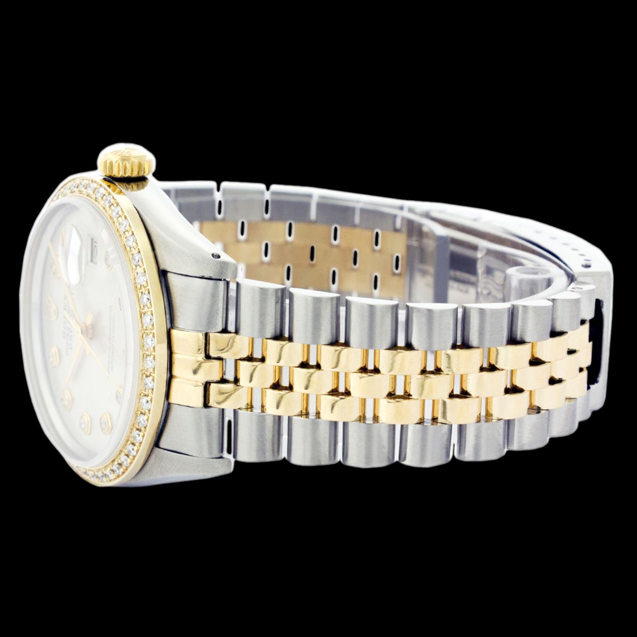 WATCH DETAILS: ITEM: WatchBRAND: RolexTYPE: Two ToneFEATURE: QuickSetMODEL: DateJustMADE: Swiss MadeGENDER: Men'sCONDITION: Pre-OwnedFUNCTION: DateDIAL COLOR: whiteHOUR MARKERS: 10 Round Custom Made DiamondBEZEL TYPE: Custom Made Diamond BezelBEZEL STONE: Diamond 1.14 CTW G-VVS1 BEZEL MATERIAL: 18K GoldBRACELET TYPE: Jubilee BRACELET MATERIAL: 14K Yellow Gold & Stainless SteelCLASP TYPE: Folding ClaspCLASP MATERIAL: Stainless SteelCASE STONE: CASE SIZE: 36mmCRYSTAL: Scratch Resistance Sapphire CrystalMOVEMENT: Automatic (Self Winding)CALIBER: 3035CROWN TYPE: Screw Down CrownWATER RESISTANCE: Waterproof to 10 ATM/100 meters/330 feetMODEL #: 16013SKU #: AMTJQS18We Buy/Sell/Trade Valuable watches, Please call us