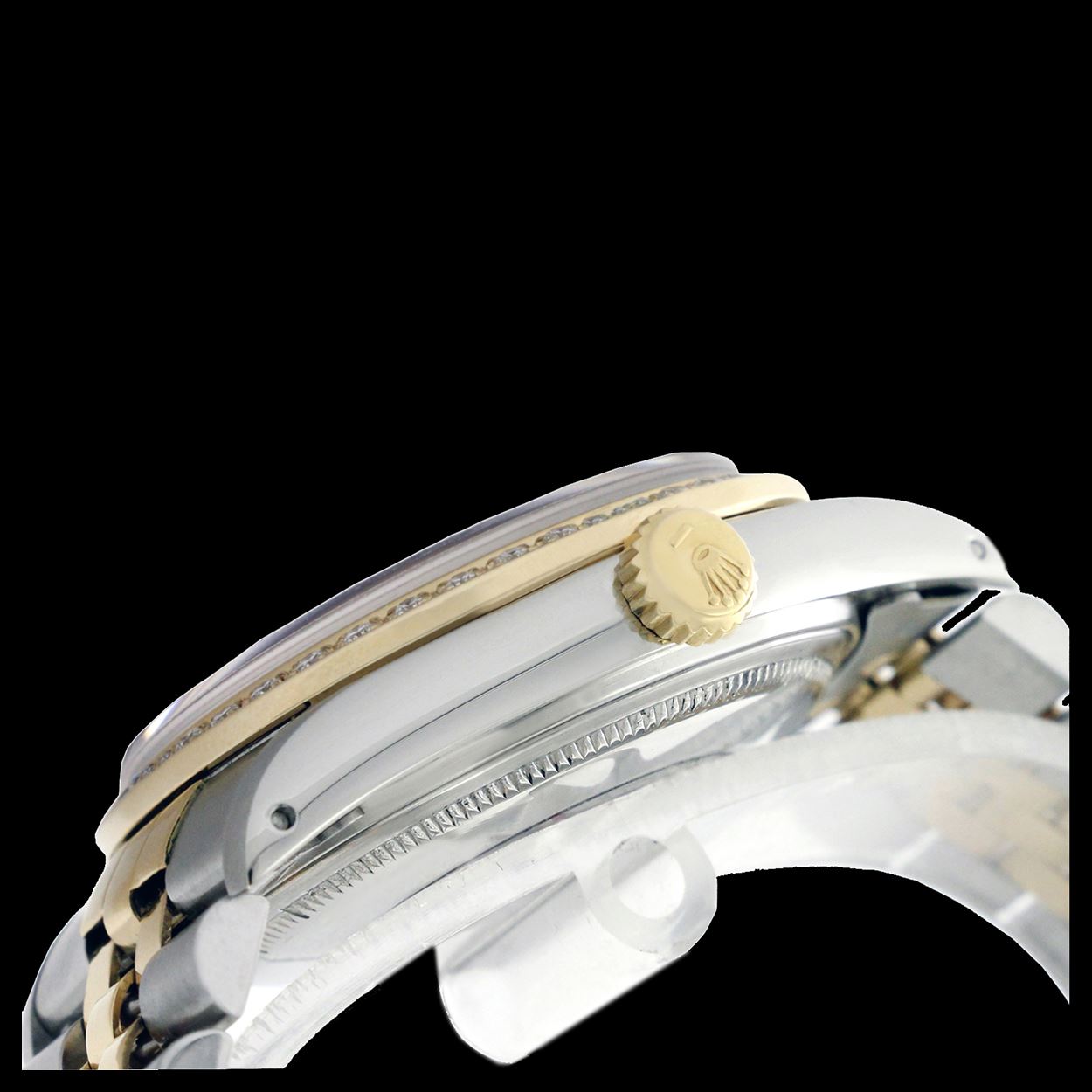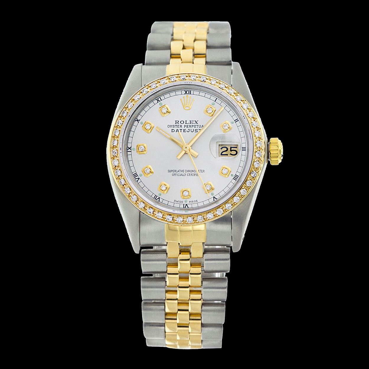 WATCH DETAILS: ITEM: WatchBRAND: RolexTYPE: Two ToneFEATURE: QuickSetMODEL: DateJustMADE: Swiss MadeGENDER: Men'sCONDITION: Pre-OwnedFUNCTION: DateDIAL COLOR: whiteHOUR MARKERS: 10 Round Custom Made DiamondBEZEL TYPE: Custom Made Diamond BezelBEZEL STONE: Diamond 1.14 CTW G-VVS1 BEZEL MATERIAL: 18K GoldBRACELET TYPE: Jubilee BRACELET MATERIAL: 14K Yellow Gold & Stainless SteelCLASP TYPE: Folding ClaspCLASP MATERIAL: Stainless SteelCASE STONE: CASE SIZE: 36mmCRYSTAL: Scratch Resistance Sapphire CrystalMOVEMENT: Automatic (Self Winding)CALIBER: 3035CROWN TYPE: Screw Down CrownWATER RESISTANCE: Waterproof to 10 ATM/100 meters/330 feetMODEL #: 16013SKU #: AMTJQS41We Buy/Sell/Trade Valuable watches, Please call us