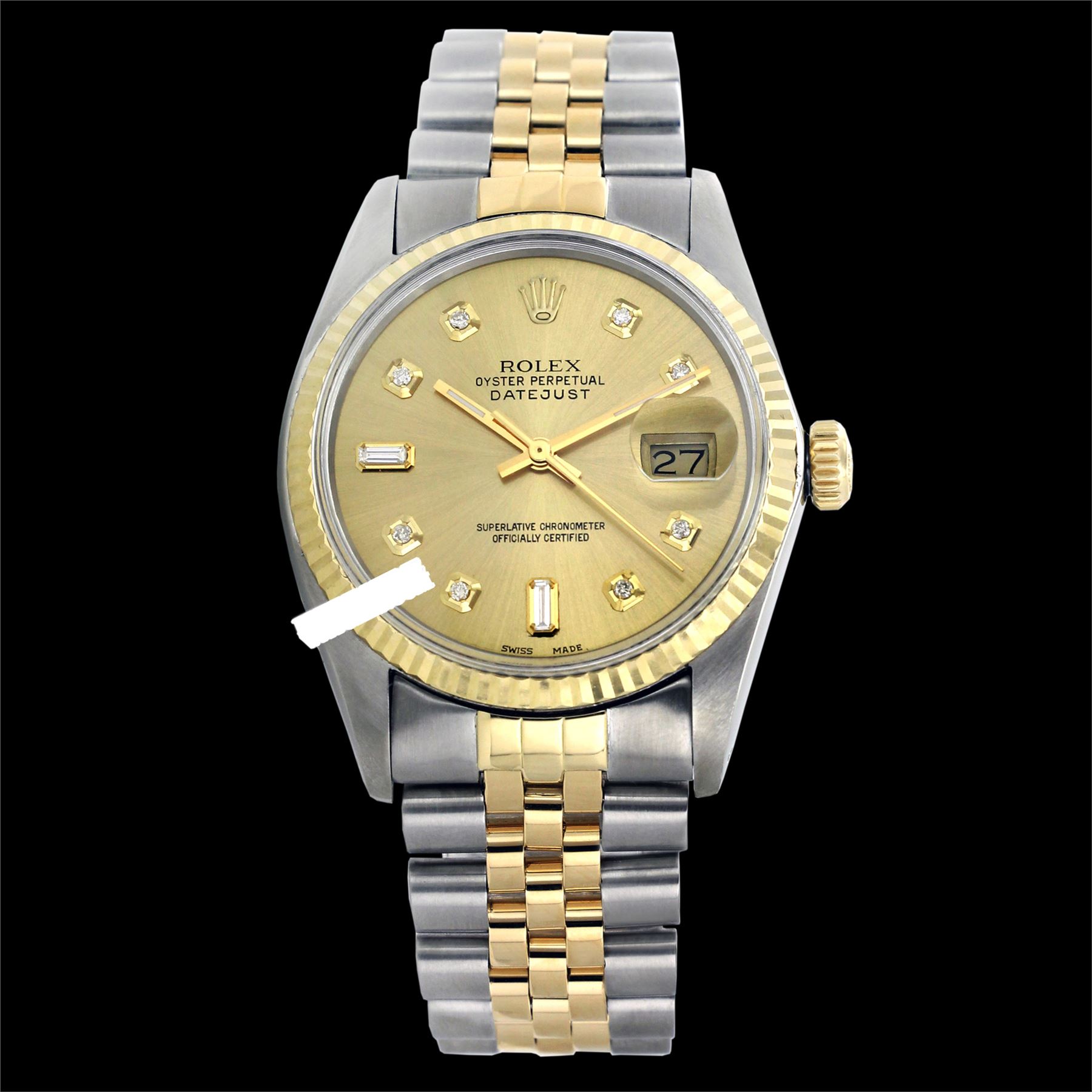 WATCH DETAILS: ITEM: WatchBRAND: RolexTYPE: Two ToneFEATURE: QuickSetMODEL: DateJustMADE: Swiss MadeGENDER: Men'sCONDITION: Pre-OwnedFUNCTION: DateDIAL COLOR: ChampagneHOUR MARKERS: 8 + 2 , 8 Round and 2 Baguette Custom Made DiamondBEZEL TYPE: Fluted BezelBEZEL STONE: No StoneBEZEL MATERIAL: 18K GoldBRACELET TYPE: Jubilee BRACELET MATERIAL: 14K Yellow Gold & Stainless SteelCLASP TYPE: Folding ClaspCLASP MATERIAL: Stainless SteelCASE STONE: CASE SIZE: 36mmCRYSTAL: Acrylic MOVEMENT: Automatic (Self Winding)CALIBER: 3035CROWN TYPE: Screw Down CrownWATER RESISTANCE: Waterproof to 10 ATM/100 meters/330 feetMODEL #: 16013SKU #: AMTJQP14We Buy/Sell/Trade Valuable watches, Please call us
