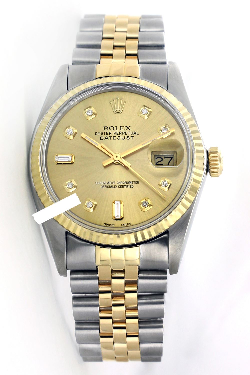 WATCH DETAILS: ITEM: WatchBRAND: RolexTYPE: Two ToneFEATURE: QuickSetMODEL: DateJustMADE: Swiss MadeGENDER: Men'sCONDITION: Pre-OwnedFUNCTION: DateDIAL COLOR: ChampagneHOUR MARKERS: 8 + 2 , 8 Round and 2 Baguette Custom Made DiamondBEZEL TYPE: Fluted BezelBEZEL STONE: No StoneBEZEL MATERIAL: 18K GoldBRACELET TYPE: Jubilee BRACELET MATERIAL: 14K Yellow Gold & Stainless SteelCLASP TYPE: Folding ClaspCLASP MATERIAL: Stainless SteelCASE STONE: CASE SIZE: 36mmCRYSTAL: Acrylic MOVEMENT: Automatic (Self Winding)CALIBER: 3035CROWN TYPE: Screw Down CrownWATER RESISTANCE: Waterproof to 10 ATM/100 meters/330 feetMODEL #: 16013SKU #: AMTJQP14We Buy/Sell/Trade Valuable watches, Please call us