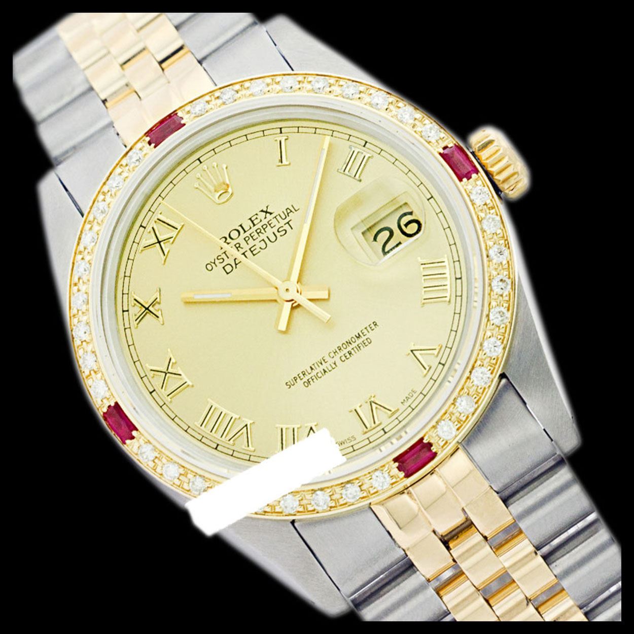 WATCH DETAILS: ITEM: WatchBRAND: RolexTYPE: Two ToneFEATURE: QuickSetMODEL: DateJustMADE: Swiss MadeGENDER: Men'sCONDITION: Pre-OwnedFUNCTION: DateDIAL COLOR: ChampagneHOUR MARKERS: RomanBEZEL TYPE: Custom Made Diamond & Ruby BezelBEZEL STONE: Diamond G-VVS1 & 4 Burmise RubyBEZEL MATERIAL: 18K GoldBRACELET TYPE: Jubilee BRACELET MATERIAL: 14K Yellow Gold & Stainless SteelCLASP TYPE: Folding ClaspCLASP MATERIAL: Stainless SteelCASE STONE: CASE SIZE: 36mmCRYSTAL: Scratch Resistance Sapphire CrystalMOVEMENT: Automatic (Self Winding)CALIBER: 3035CROWN TYPE: Screw Down CrownWATER RESISTANCE: Waterproof to 10 ATM/100 meters/330 feetMODEL #: 16013SKU #: AMTJQS15We Buy/Sell/Trade Valuable watches, Please call us