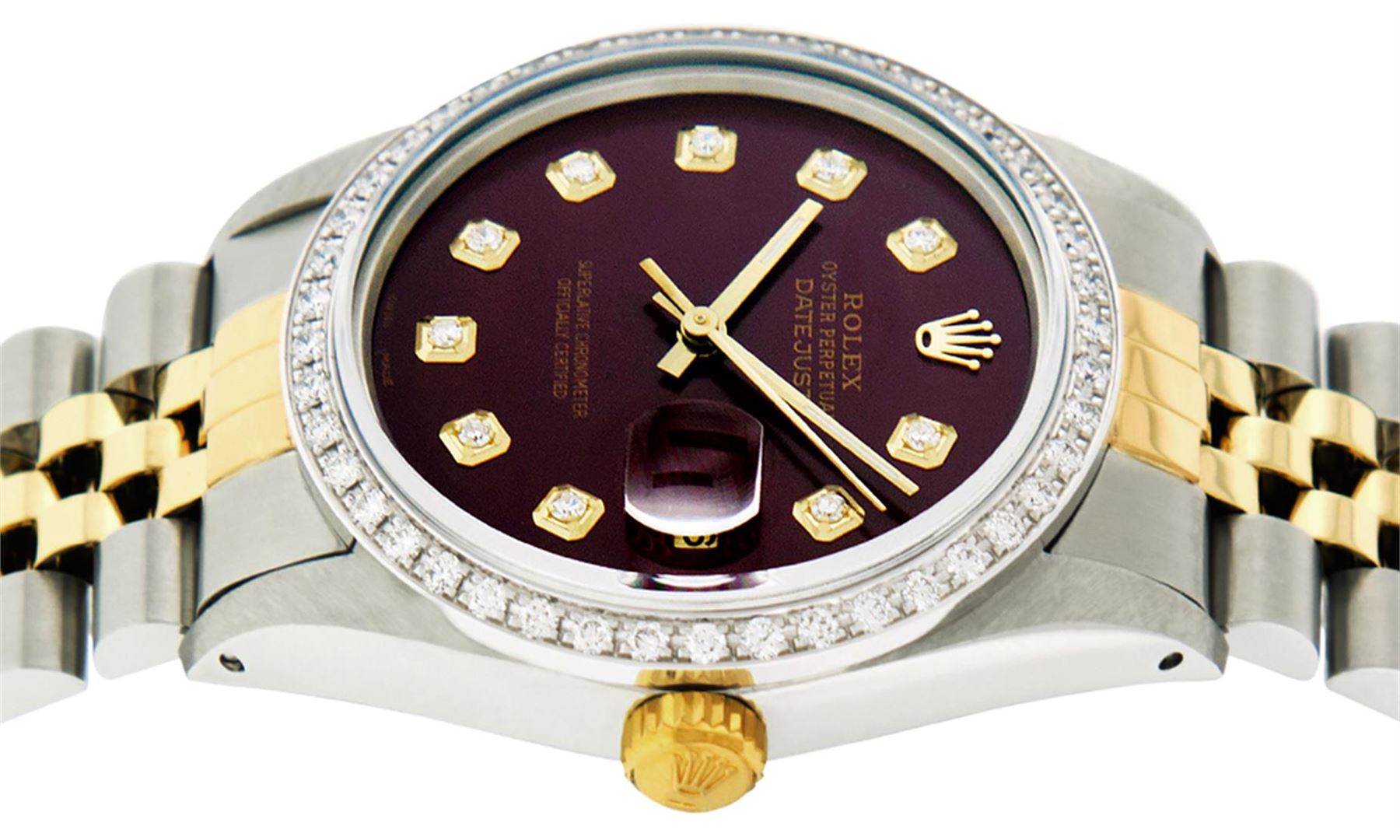 One Men's 14K Yellow Gold Two Tone Rolex Datejust Polished, Serviced & Electronically Tested, 18K Yellow Gold & Stainless Steel Case: 36mm, 18K Yellow Gold Crown, Custom Bezel: New 18K White Gold Beadset Diamond Bezel, Diamond Count: 44 Diamonds, Total Weight 1.00 Carat, Clarity: SI-VS, Color: G to H. Crystal: New Synthetic Sapphire Cyclops Lens. Custom Hands: New Luminescent Hands. Movement: Automatic Winding Movement Caliber 3035. Custom Dial: Maroon Diamond, Diamond Count: 10 Diamonds in Dial G To H In Color, Clarity: VS, Date Window: 3 O'Clock Position Date Display, Quickset, Model: 16013 Condition: G-6 Extra Fine. Bracelet: Two Tone 14K Yellow Gold & Stainless Steel Jubilee. Bright Polish. 7.0 Inch Length, Adjustable. Standard Clasp, With Rolex Logo. This Watch Has Been Serviced Time Tested And Is In Excellent Condition It Is Free Of All Scratches And Dents.