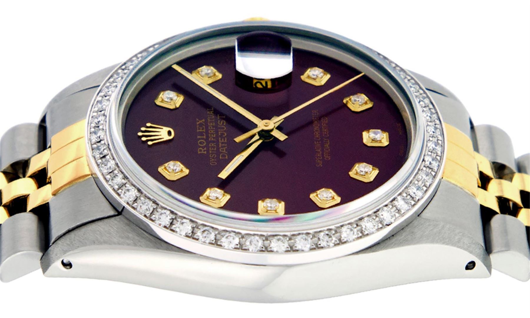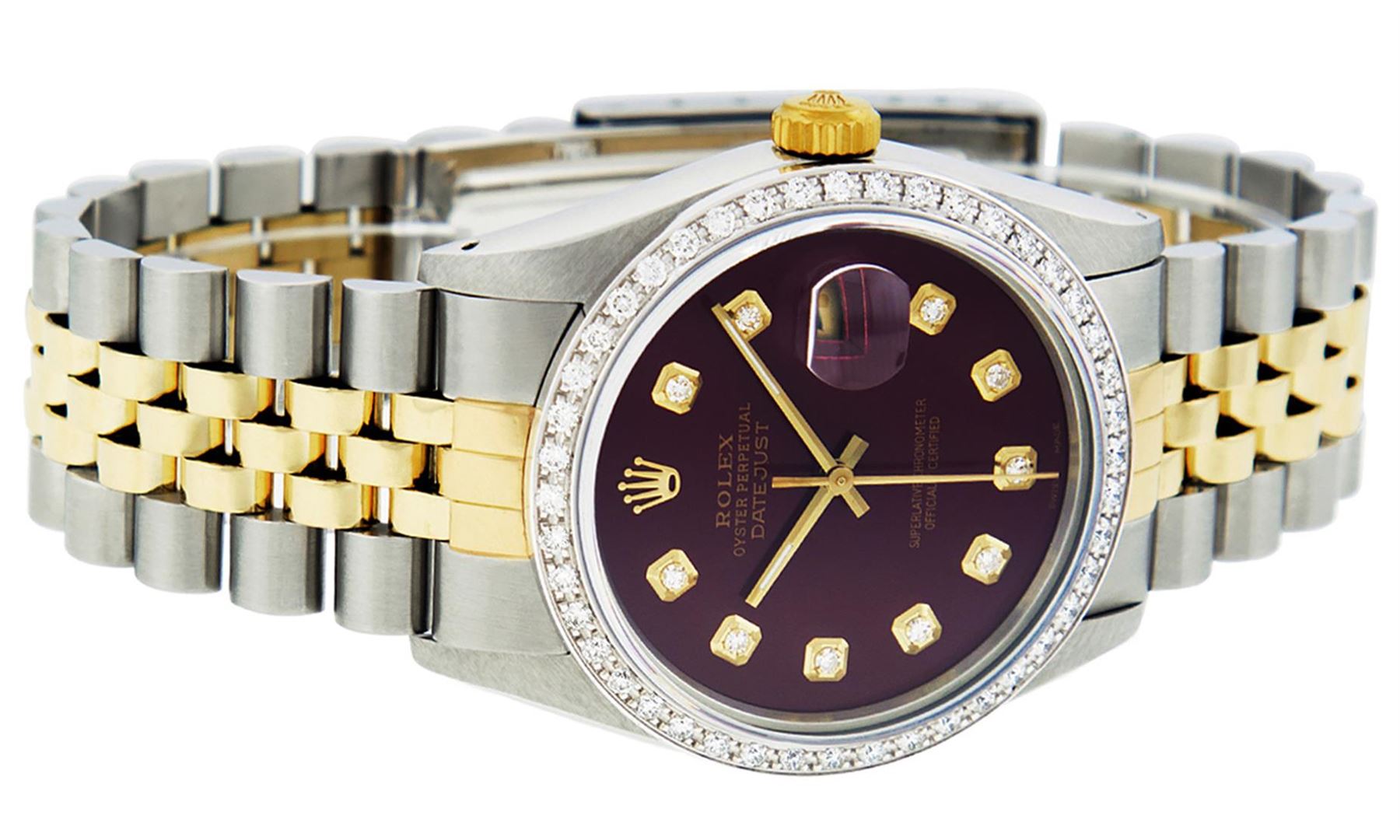 One Men's 14K Yellow Gold Two Tone Rolex Datejust Polished, Serviced & Electronically Tested, 18K Yellow Gold & Stainless Steel Case: 36mm, 18K Yellow Gold Crown, Custom Bezel: New 18K White Gold Beadset Diamond Bezel, Diamond Count: 44 Diamonds, Total Weight 1.00 Carat, Clarity: SI-VS, Color: G to H. Crystal: New Synthetic Sapphire Cyclops Lens. Custom Hands: New Luminescent Hands. Movement: Automatic Winding Movement Caliber 3035. Custom Dial: Maroon Diamond, Diamond Count: 10 Diamonds in Dial G To H In Color, Clarity: VS, Date Window: 3 O'Clock Position Date Display, Quickset, Model: 16013 Condition: G-6 Extra Fine. Bracelet: Two Tone 14K Yellow Gold & Stainless Steel Jubilee. Bright Polish. 7.0 Inch Length, Adjustable. Standard Clasp, With Rolex Logo. This Watch Has Been Serviced Time Tested And Is In Excellent Condition It Is Free Of All Scratches And Dents.